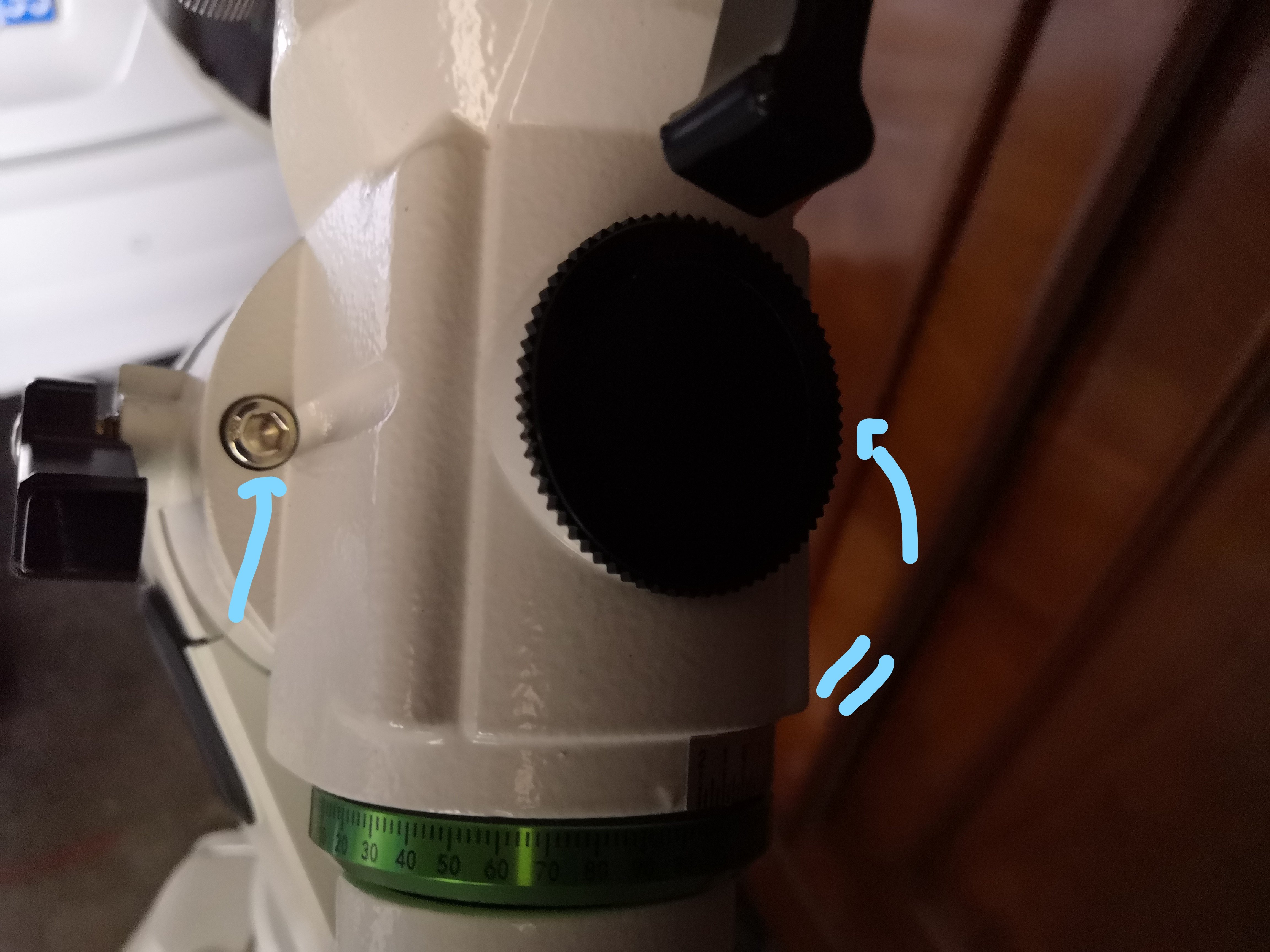 Pour la mes, je commence par faire la mise à niveau, puis j'aligne la polaire au centre du viseur polaire, pour, par la suite la placer correctement sur le 0, après je prend la position de "l'étoile polaire dans le viseur" avec l'application SynScan Pro, c'était 7:33, je place donc la polaire à cette valeur.
