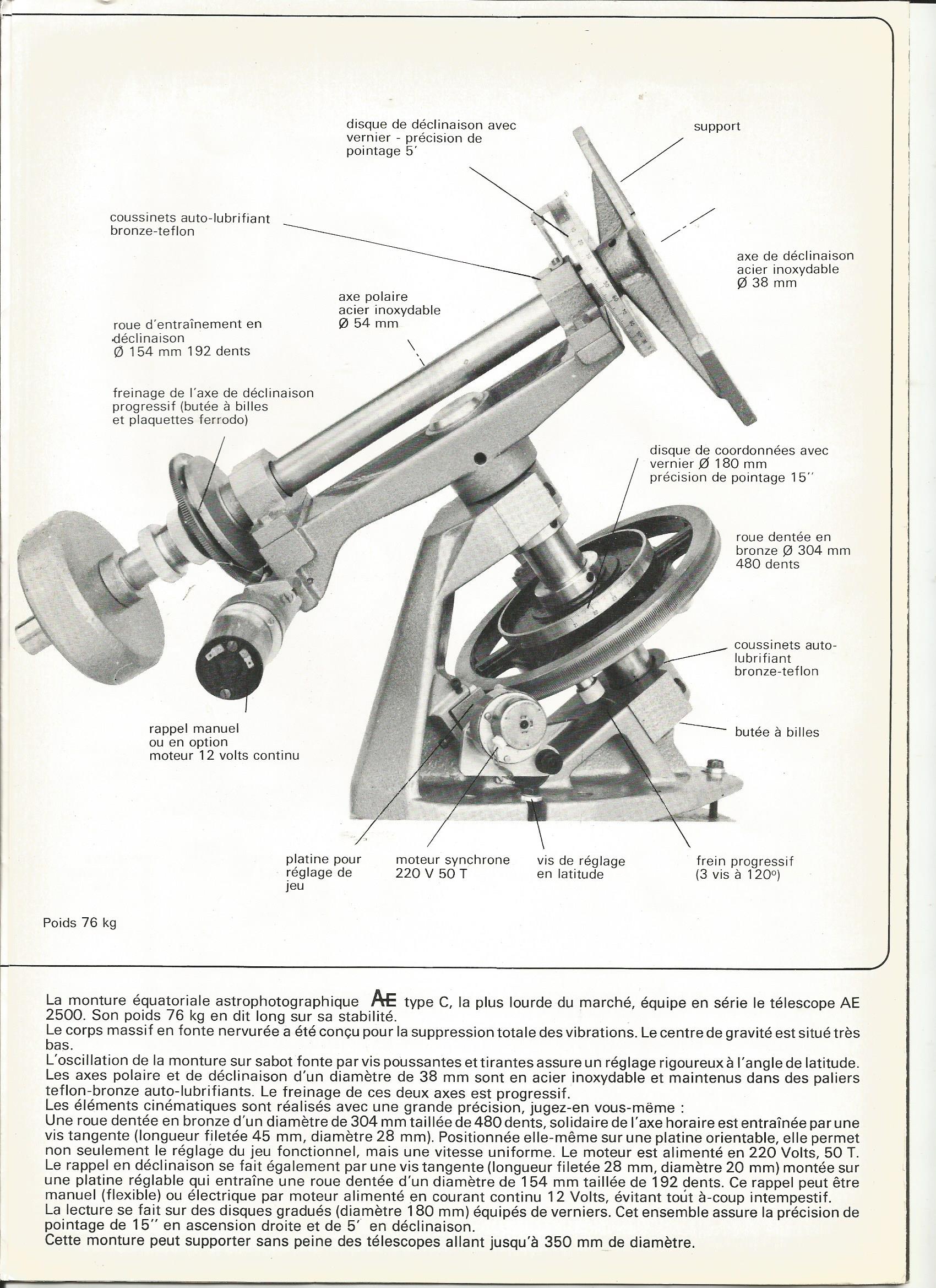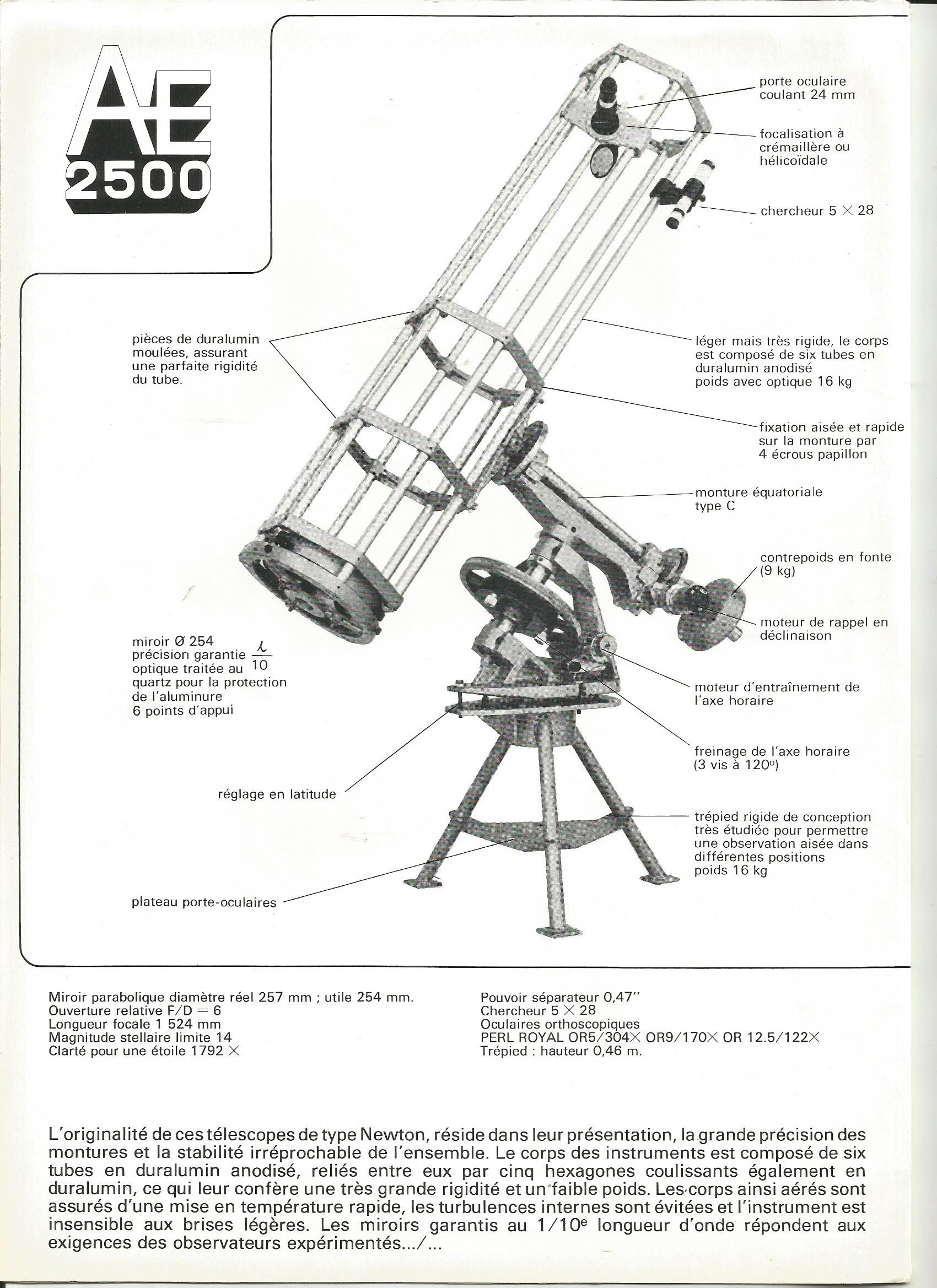 staffy Posté 14 juin 2020 Posté 14 juin 2020 Le 14/06/2020 à 15:08, xs_man a dit : Par contre il y a une subtilité dans la désignation des montures fabriquées par Astronomical Equipment à leur usine de Luton : Si on compare le catalogue AE de 1970/1971 donné dans ton lien : : Aux montures présentées dans la bible, le catalogue Médas/Perl de 1984 dans ton post dédié http://www.astrosurf.com/costi/Catalogues/Perl 1ier trimestre 1984/ Ainsi que dans les brochures dédiées que l'on trouve sur le site d'Astro45 : On voit que ces montures ont évolué entre temps : La Type "A" de 1971 a été renommée en Type "B", La Type "B" de 1971 est passée en Type "C", Et son design est très différent : le socle n'est plus le même et la grande roue dentée a été descendue entre les paliers. Par contre plus du tout de Type "D". Et c'est vraiment bien dommage ! Oui, lors de la mise en place des catalogues dans les différentes parties du sujet "catalogues et documentations diverses", j'avais bien vu les différences entre le catalogue A.E 1970 avec ses 3 montures et 4 instruments : A (6 " et 8 1/2"), B (10 1/4") et D (11 3/4") et le catalogue Perl Médas et ses 2 montures Perl-AE types B et C, mais le seul but des 3 photos épinglées n'était que simplement destiné à répondre à ta demande ("Quelle est la couleur d'origine ??? Il y a des traces de peinture texturée type Hammerite gris/vert sur le tube mais quid de la monture et du pied ?"). Concernant ce document : http://www.hamaldemon.com/images/I&I News NS 29.pdf (que je vais intégrer dans le sujet "catalogues et documentations diverses"), il "évoque la restauration d'une de ces montures (portant un magnifique Newton/Cassegrain de 350 mm f/5-20", mais apporte également une réponse qui confirme le fait que la couleur des télescopes A E est traditionnellement l'argent.