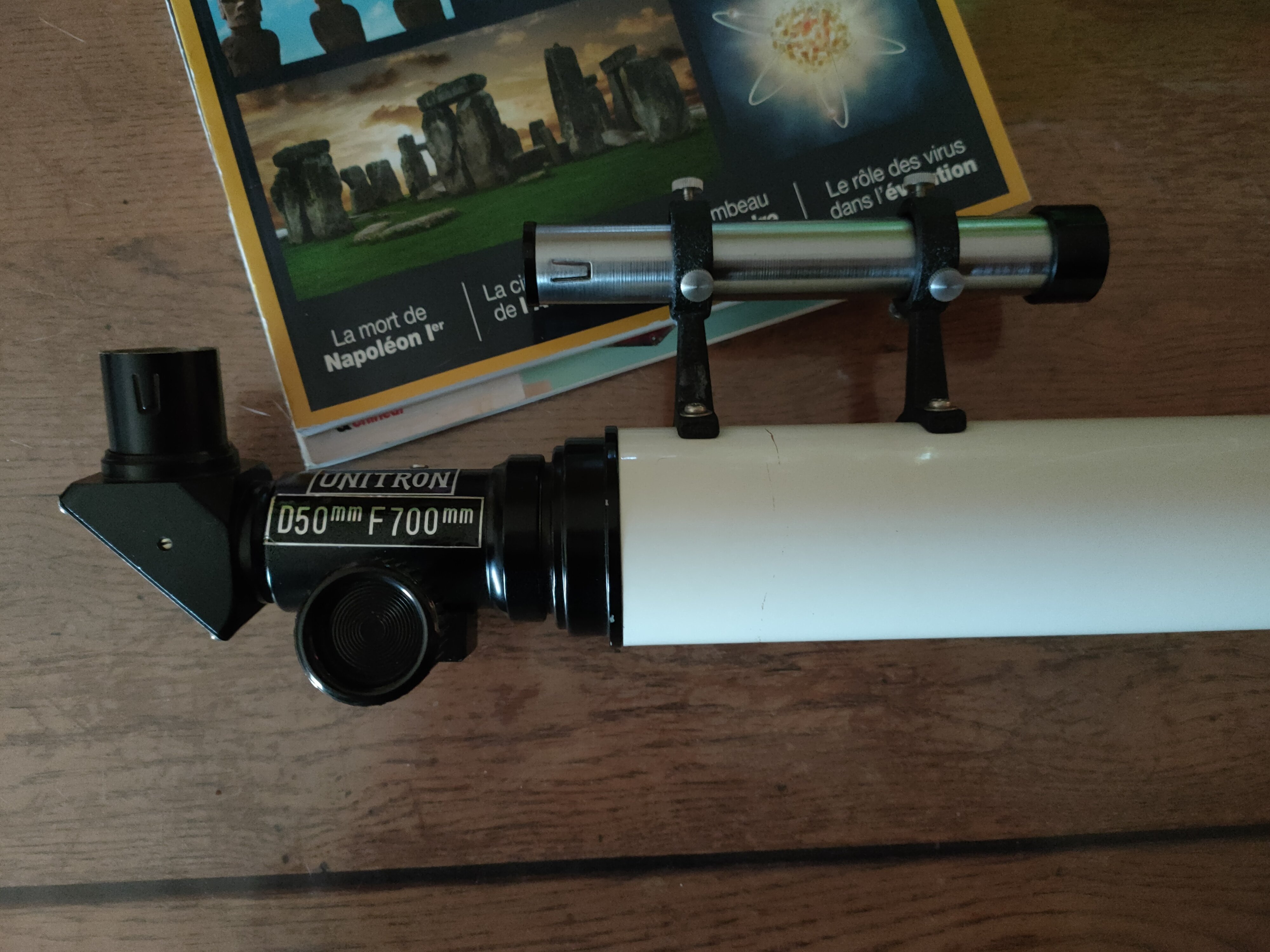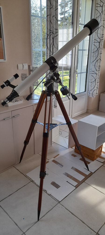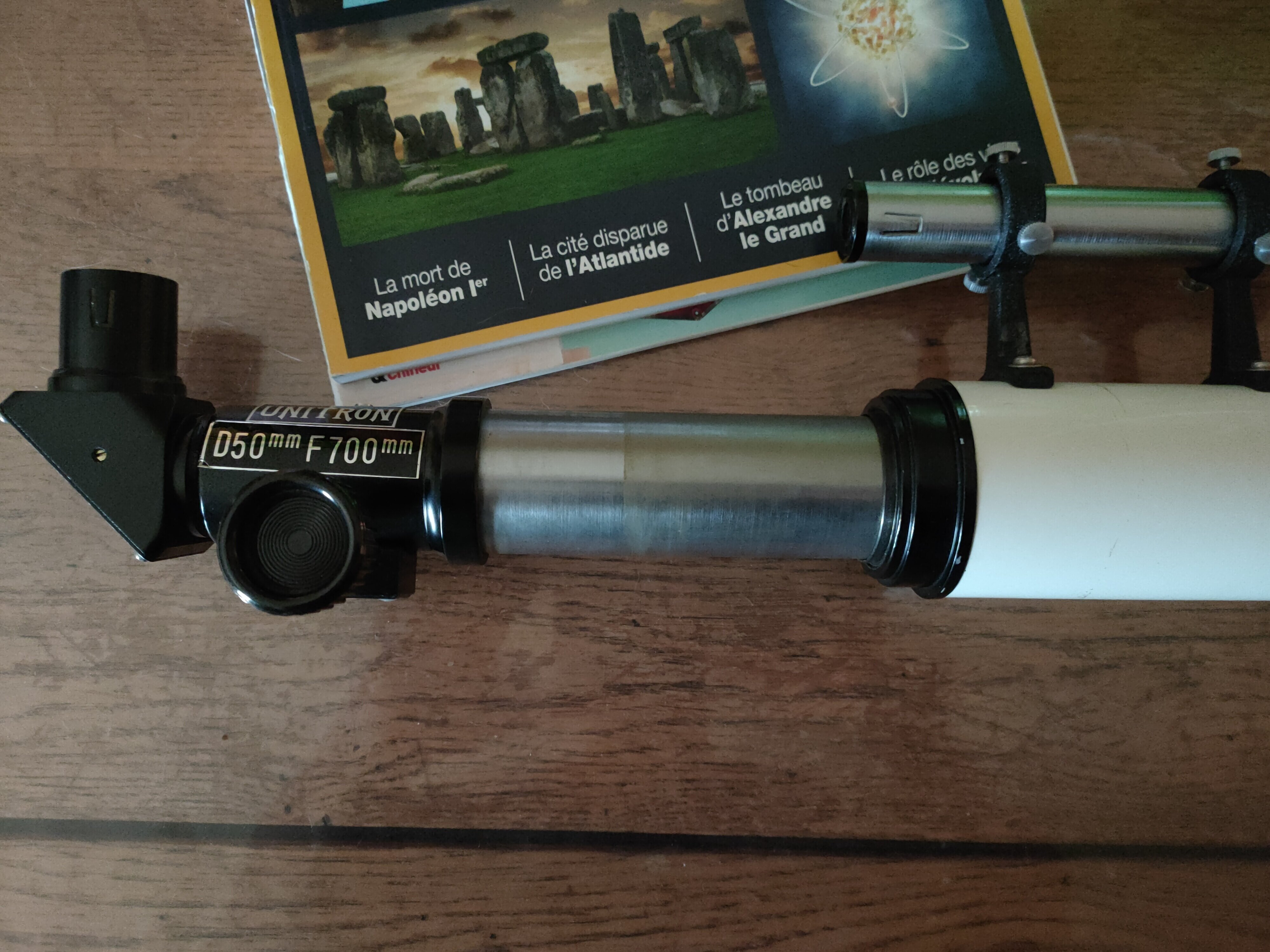 lyl Posté 24 octobre 2021 Posté 24 octobre 2021 (modifié) Disponible dans quelques jours : manque un flexible pour le mouvement fin commandé chez Pierro-Astro graissage monture, tuning de l'optique et raffraichissement en cours Je ne la mets pas sur les PA WA pour le moment pour exclusivité ici, et après réflexion j'ai retiré l'annonce des PA astrosurf. *** me contacter *** Mizar 60/910 historique de chez Hino Optical. Tube bakélite peint (inventé en 1909, commercialisé en 1930, popularisée pour les vieux téléphones, c'est chargé en poussière de bois à l'époque, parfois chargé en carbone). C'est le premier polymère. Optique Hino ou Vixen (suis en train de comparer les doublets que j'ai) RC à prisme et 3 oculaires (B6 Asahi Pentax nettoyé provenant de chez Jorris, Ke12.5, HM20 neuf acheté avec le projet 80mm) Le chercheur est minimal mais utile. Fort potentiel : x150 (2.5D) en terrestre sans soucis. (autre ) x45 et x73. L' AZ custom Vixen, trepied AL90 Vixen est pile ce qu'il faut sur ce réfracteur ça tient les x150 en suivi sans trop d'efforts. Je donne un filtre lunaire et solaire à poser dans le coulant du RC. http://www.astrosurf.com/topic/117244-anciens-oculaires/?do=findComment&comment=2095088 --------------------------- Bafflage correct. J'ai permuté les objectifs, un peu à regret car le Hino Optical, certes ébreché, n'est pas à recorriger (il est vraiment bon même en terrestre) mais l'éclat fait 7mm x20mm 🤥 J'en ai pour 1h de boulot pour l'adapter aux oculaires : flûte. Ceci dit, ou le Vixen est bien débordé, pas de coma ni d'astig visible et ... calé bas. De beaux anneaux en intra-focale, on voyait dejà des bandes sur Jupiter et de jolis petits cratères sur la Lune ce soir. Il supportera un recalage pour corriger la sous-correction de l'aberration sphérique. => PO nettoyé, il faudrait une graisse plus dure mais bon, cette nuit c'était agréable pour la map. Retenir le nom et le logo Hino Opt, précurseur de Mizar (on le voit au nom entouré de double quotes) : c'est très bon, simple à certains égards mais avec les pièces plus couteuses quand c'est nécessaire, apparemment meilleur optiquement que Vixen dans les années 50-70. Modifié 24 octobre 2021 par lyl
