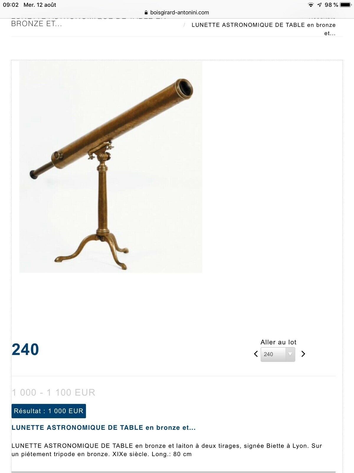 staffy Posté 1 février 2022 Posté 1 février 2022 Je verrais bien cette lunette Biette identique à celle ci (datée du XIX siècle) : Lunette Astronomique XIX BIETTE A LYON | eBay ( malgré que cet exemplaire soit incomplet et en état moyen).