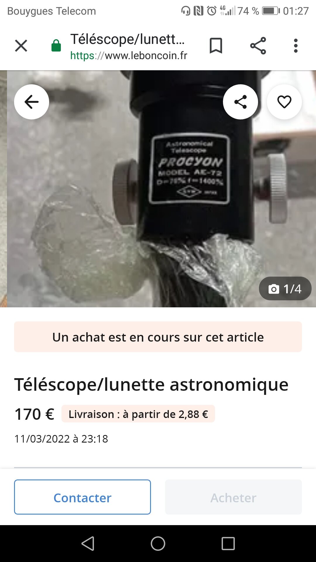 PEV77 Posté 18 mars 2022 Posté 18 mars 2022 Il y a 3 heures, astrocg a dit : Proposé un peu cher tout de même ! il y a absolument tous les accessoires ! la monture est motorisée et même la lunette en parallèle : probablement un bon choix. il y a 4 minutes, macfly51 a dit : S'il est en bon état, avec tous ses accessoires, et vue la rareté de la chose, il est peut-être même sous évalué.... oui, trés probable, je ne connaissais qu'une personne ayant ce 100/600 et il était excellent...j'ai pu obtenir le grand-frère : le 120/720 à 250 euros mais sans oculaires et avec une monture non motorisable...et quelques rayures aussi.
