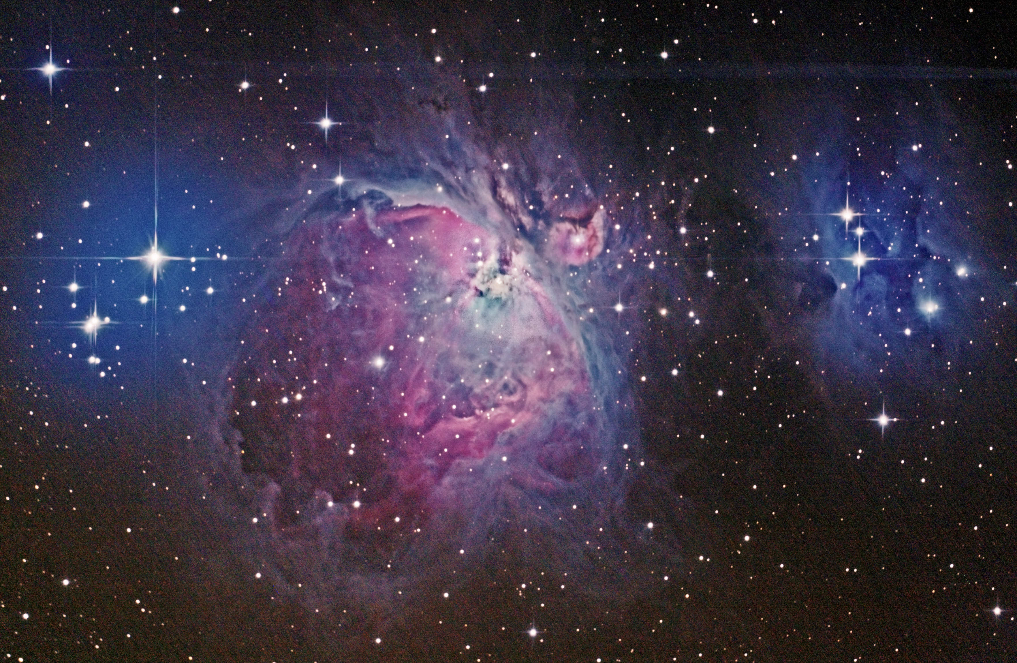 Malheureusement j'ai eu un reflet (bande bleue au dessus de la nébuleuse running man) + un reste du voile nuageux qui m'a fait une auréole bleue autour des étoiles à gauche malgré le tri des unitaires.