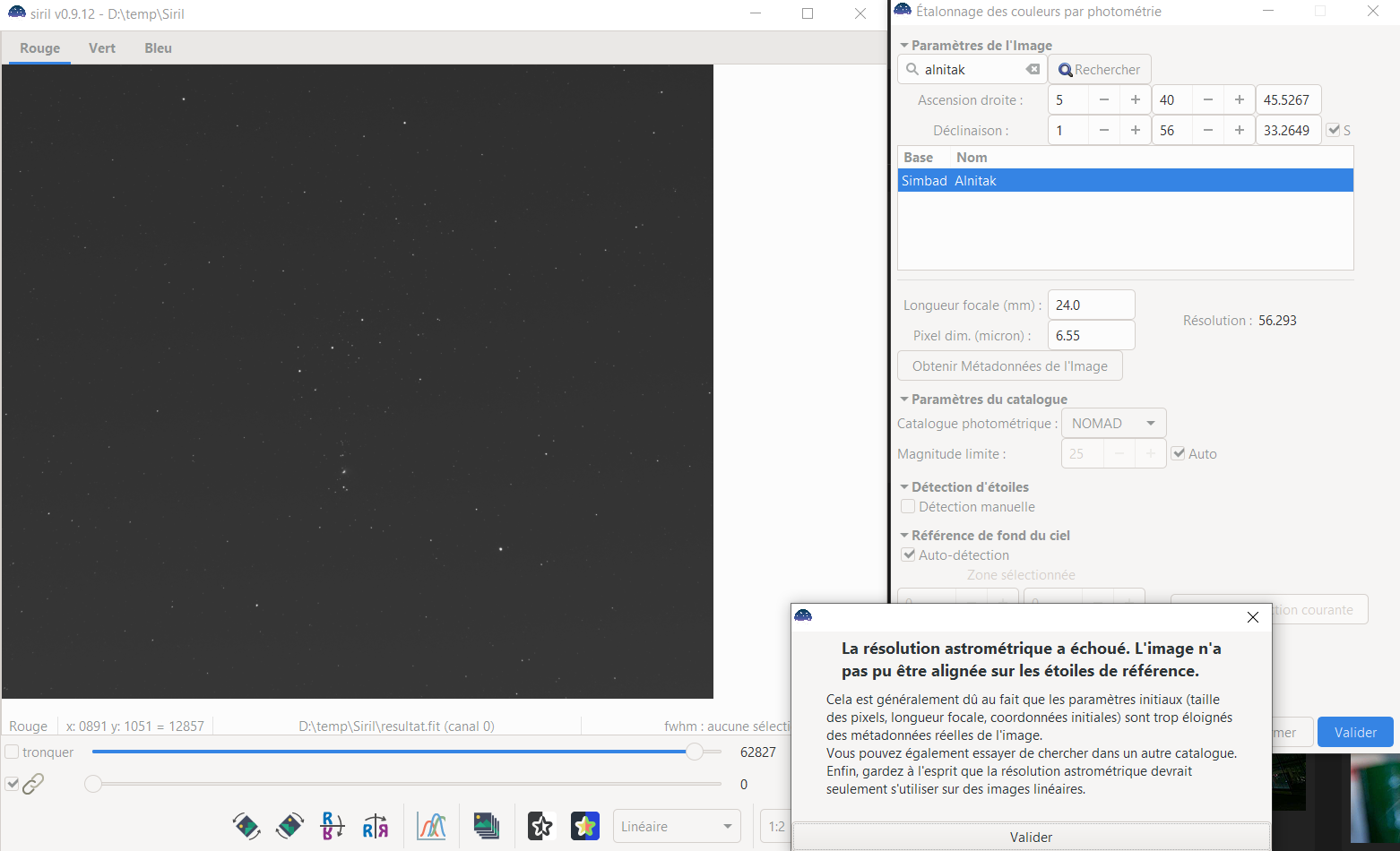 Fred_76 Posté 23 février 2020 Posté 23 février 2020 Bonjour J'essaye en vain de calibrer les couleurs d'une photo en utilisant l'étalonnage par photométrie. Mes photos ont été prises à 24 mm de focale avec un Canon 6D (pixels = 6.55 µm). J'ai beau laisser Siril chercher dans Nomad ou Apass, ou bien sélectionner les étoiles manuellement, rien n'y fait, à chaque fois c'est l'échec : J'ai bien essayer de régler les paramètres sur Alnitak, Orion, M41, Betelgeuse... nada. Y-a-t-il une focale mini en dessous de laquelle Siril ne peux plus faire l'astrométrie ? Ou bien un champ maximal ? Bref, je coince...