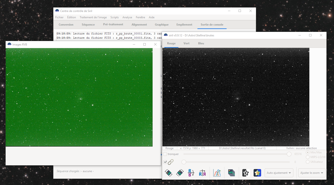 morbli Posté 26 février 2020 Posté 26 février 2020 (modifié) Bonjour, un membre de mon club possède un Stellina avec lequel il aimerait traiter les images enregistrées. Je lui ai naturellement proposé d'utiliser Siril pour traiter ces images car avec les scripts livrés, pas de prise de tête pour lui. Les fichiers issus du Stellina sont des .fits nommés img-0001.fits, img-0002.fits, etc.... Je les ai déposé dans le dossier 'brutes' du répertoire de travail L'analyse du header du fits indique BAYERPAT= 'RGGB ' / Bayer pattern 1er essai avec le script Pre-traitement_APN_SansFlat_NiDark_NiOffset.ssf: Echec du script, voir fichier log 2020-02-26T07.46.09Z.log Une séquence img-.seq est créée mais pas de séquence brute_.seq 2ème essai avec process classiques Conversion des fits en une séquence brute N'ayant ni flats, ni dark ni offset, le bouton Pré-traiter de l'onglet Pré-Traitement est grisé. Je continue en ligne de commande en prenant les instructions du fichier script "preprocess brute_ -debayer -stretch". Une séquence pp_brute est créée Je continue en ligne de commande avec "register pp_brute_" Puis avec "stack r_pp_brute_ rej 3 3 -norm=addscale -out=../resultat" Et là, je me retrouve avec un fichier tout vert Bref, je ne sais plus quoi faire 2020-02-26T07.46.09Z.log Modifié 26 février 2020 par morbli