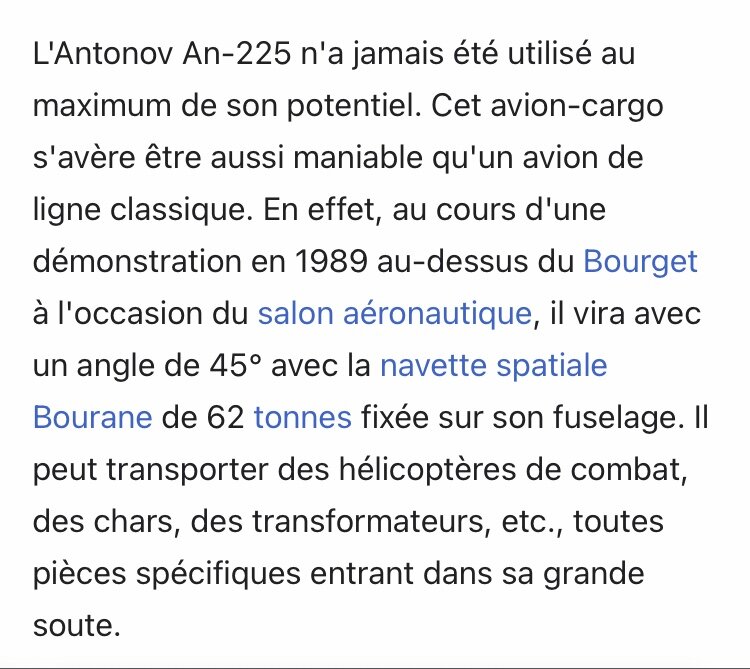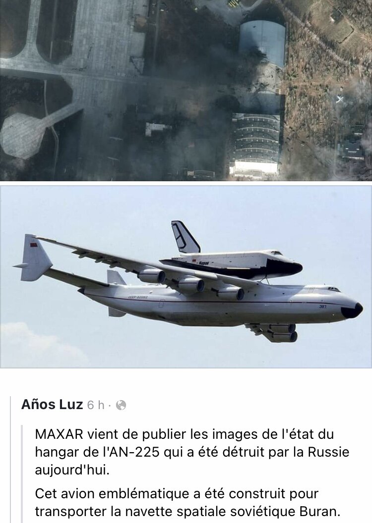 Ne serait-ce pas Mriya, l’unique Antonov 225 - plus gros avion de monde  ?   :?:   Lequel a été détruit dans son hangar de l’aéroport Hostomel en Ukraine (voir : https://fr.wikipedia.org/wiki/Aéroport_de_Hostomel ). L’autre Antonov qui n’avait jamais volé, a aussi été détruit… (voir ce qu'en a dit l'excellent Frédéric le Havrais :  https://www.webastro.net/forums/topic/202803-mriya-l’antonov-225-n’est-plus/  ).