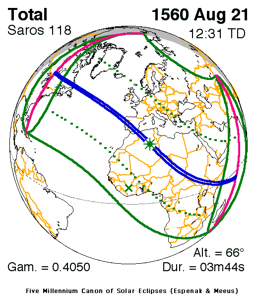 Il s'agissait de l'éclipse de Soleil du mercredi 21 août 1560 ; qui portait le numéro 6571 dans le Canon der Finsternisse” de Theodore von Oppolzer :