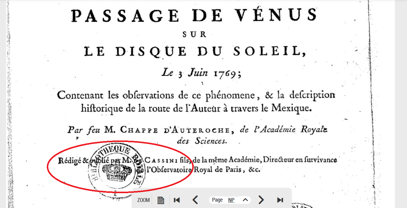 Or ce livre n'a pas été rédigé par l'Abbé Chappe d'Auteroche mais par M. de CASSINI lui-même Directeur de l'Observatoire de Paris.