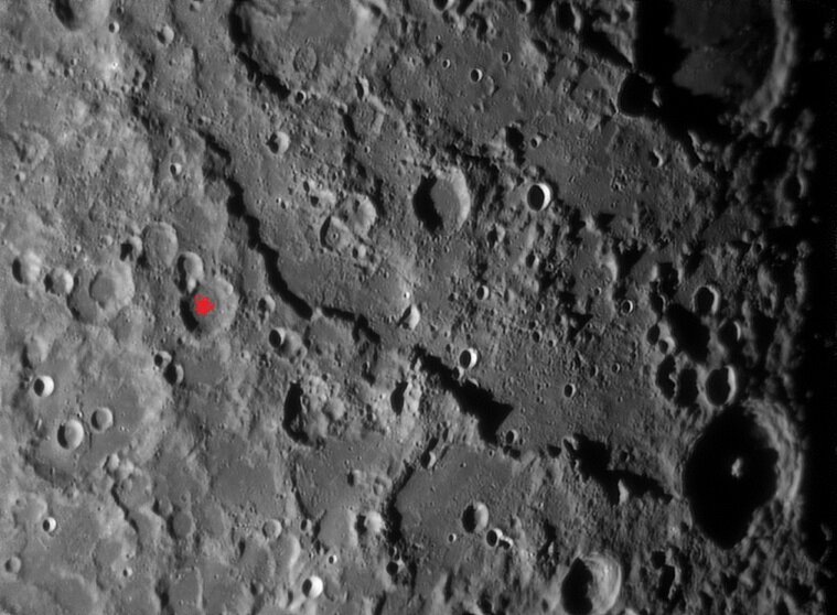 Trouvez d'abord le nom de ce cratère ( point rouge ) . Lorsque vous l'aurez, vous chercherez le numéro de l'astéroïde dédié à ce personnage.