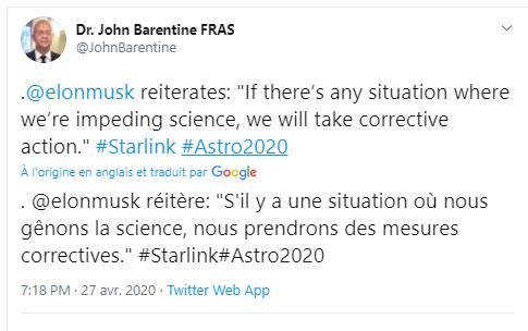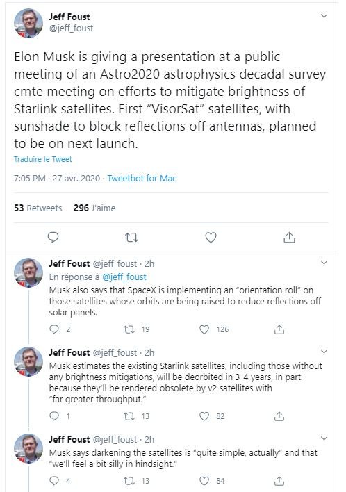 Communiqué de SpaceX : https://www.spacex.com/news/2020/04/28/starlink-update