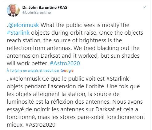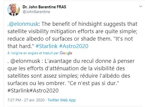 Deux liens, le premier un article de Sky&Telescope (désormais appartenant à l'AAS, l'association américaine d'astronomie), le second, un communiqué de SpaceX sur les mesures qui devraient être prises afin de réduire la pollution lumineuse de la flotte StarLink :