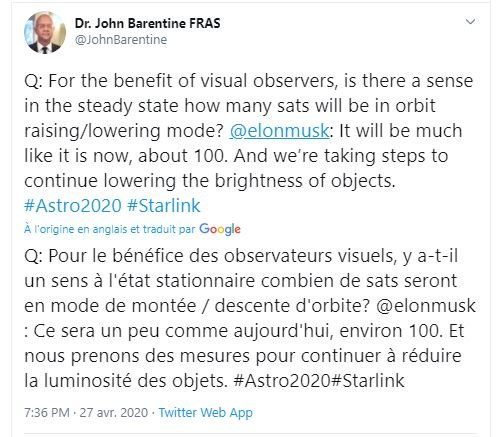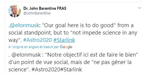Elon Musk (le Big Boss en personne) participait aujourd'hui à un meeting organisé par des astronomes pro pour discuter de l'impact des constellations de satellites sur les observations.
