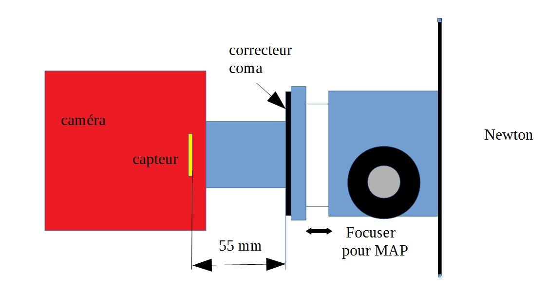 1_ En théorie ton correcteur de coma demande à ce que le capteur de la caméra principale se trouve à une distance fixe de 55 mm , ceci afin de corriger correctement les rayons en bordure de champ. Ensuite tu ajustes le focuser de ton PO afin de régler la MAP sur ton capteur, la distance de 55mm reste fixe.