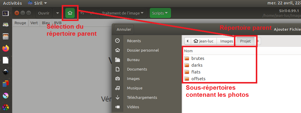 FalCT60 Posté 22 avril 2020 Auteur Posté 22 avril 2020 Il est de coutume de dire qu'une simple illustration vaut mieux qu'un long discours... J'ai constitué un répertoire nommé projet, contenant les sous-répertoires brutes, darks, flats et offsets. C'est le répertoire projet que je sélectionne via l'icône maison, Siril ira chercher les fichiers déposés dans les sous-répertoires. En espérant avoir clarifié les choses.
