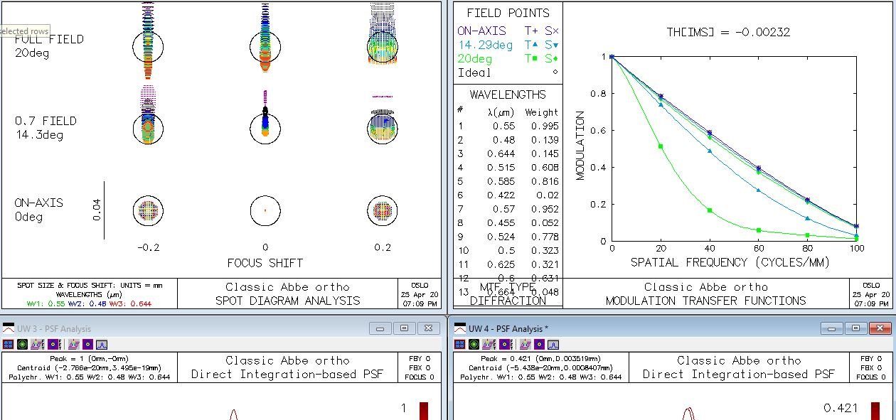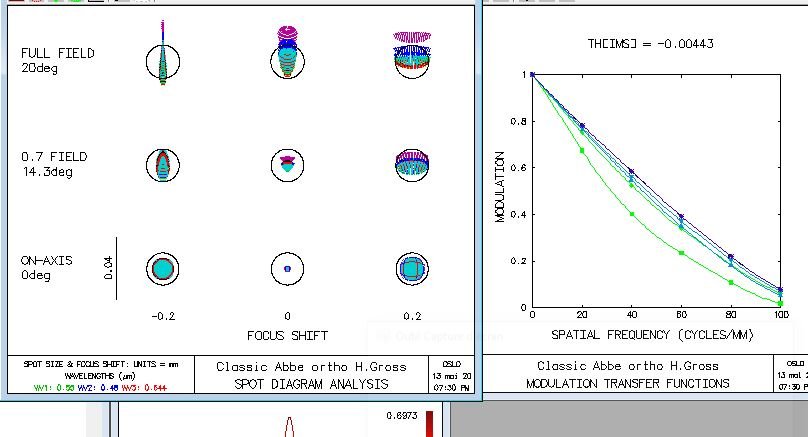 lyl Posté 25 avril 2020 Auteur Posté 25 avril 2020 (modifié) suite 2) 2) Les calculs ! Ce sont les calculs à f/10 par exemple pour une Vixen 102M (100f/10) : grossissement x100 (ce qui est peu). Le vieil Abbe "OA", verres au baryum (SF5+SK7+SF14+BAF5), le polystrehl est de 100% à 0° / centre 54.5% à 15° Le Nikon Mittenzwey-Abbe aka "the colo-eye" OAM fait en BK7 + F3, forte courbure de 3 dioptries. C'est le plus célèbre modèle des fabricants japonais avant le HD (Vixen mettait le 4mm dans sa série) Le polystrehl est de 100% à 0°, 93,7% à 15° Un Abbe "OA", plus récent par le Dr Herbert Gross Uni-Jena avec des verres un peu plus lourd, très similaires (SF10+SK14+SF14+SSK8), le polystrehl est de 100% à 0° / centre, 71.4% à 15° Modifié 13 mai 2020 par lyl 1