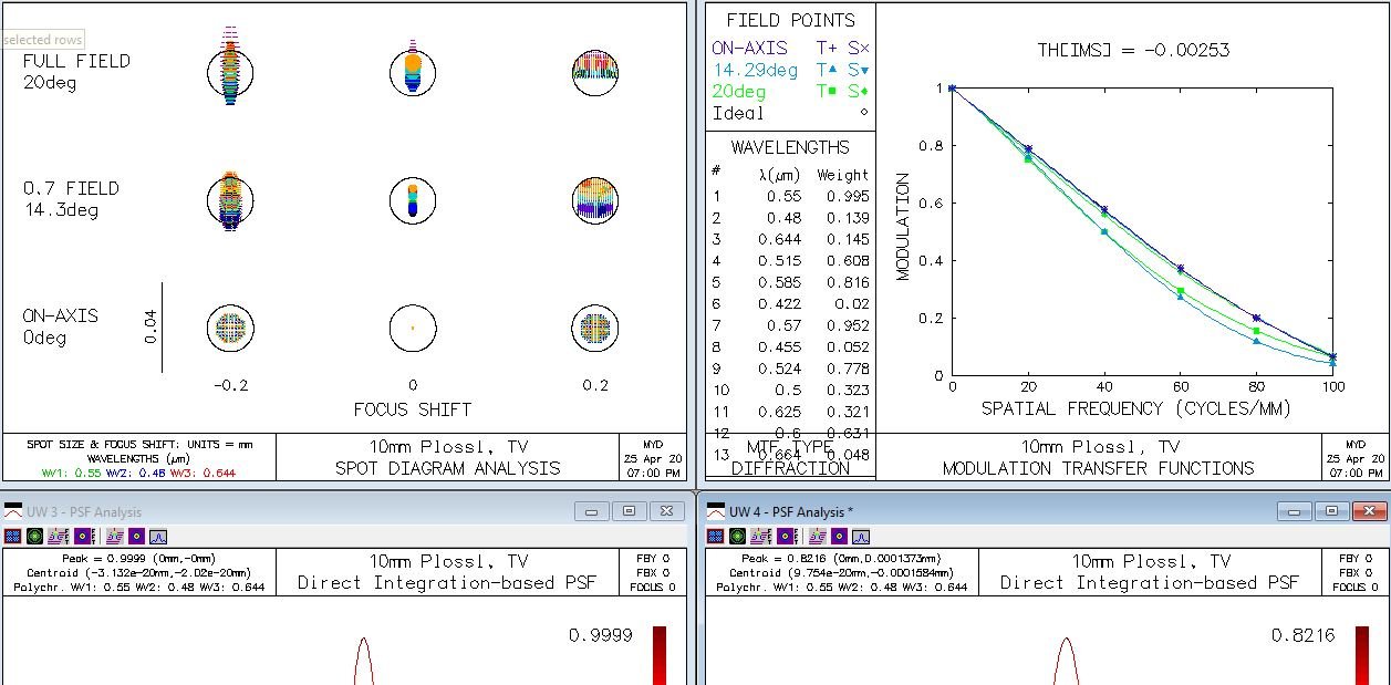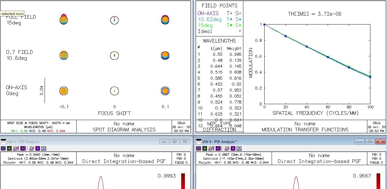 lyl Posté 25 avril 2020 Auteur Posté 25 avril 2020 (modifié) Le TMB SMC super monocentrique. BASF64+SSK8+SF4, ultra-dense. Très faible dispersion. La courbure de champ dépasse 3 dioptries, je le limite là car quasiment tout le monde s'en aperçoit et perçoit un champ limité. Le polystrehl est de 100% à 0° et 92,8% à 15°. Le plössl SAF Clavé. A cet angle la courbure est quasiment là même que le TV plössl (~ 1D) Le polystrehl est de 100% à 0° et 87% à 15° Round 1 : les orthos devant à f/10..., mais le champ comparé n'est pas optimal, il manque des degrés pour que l’œil exploite au mieux. Modifié 9 mai 2020 par lyl recalcul Clavé 1 1