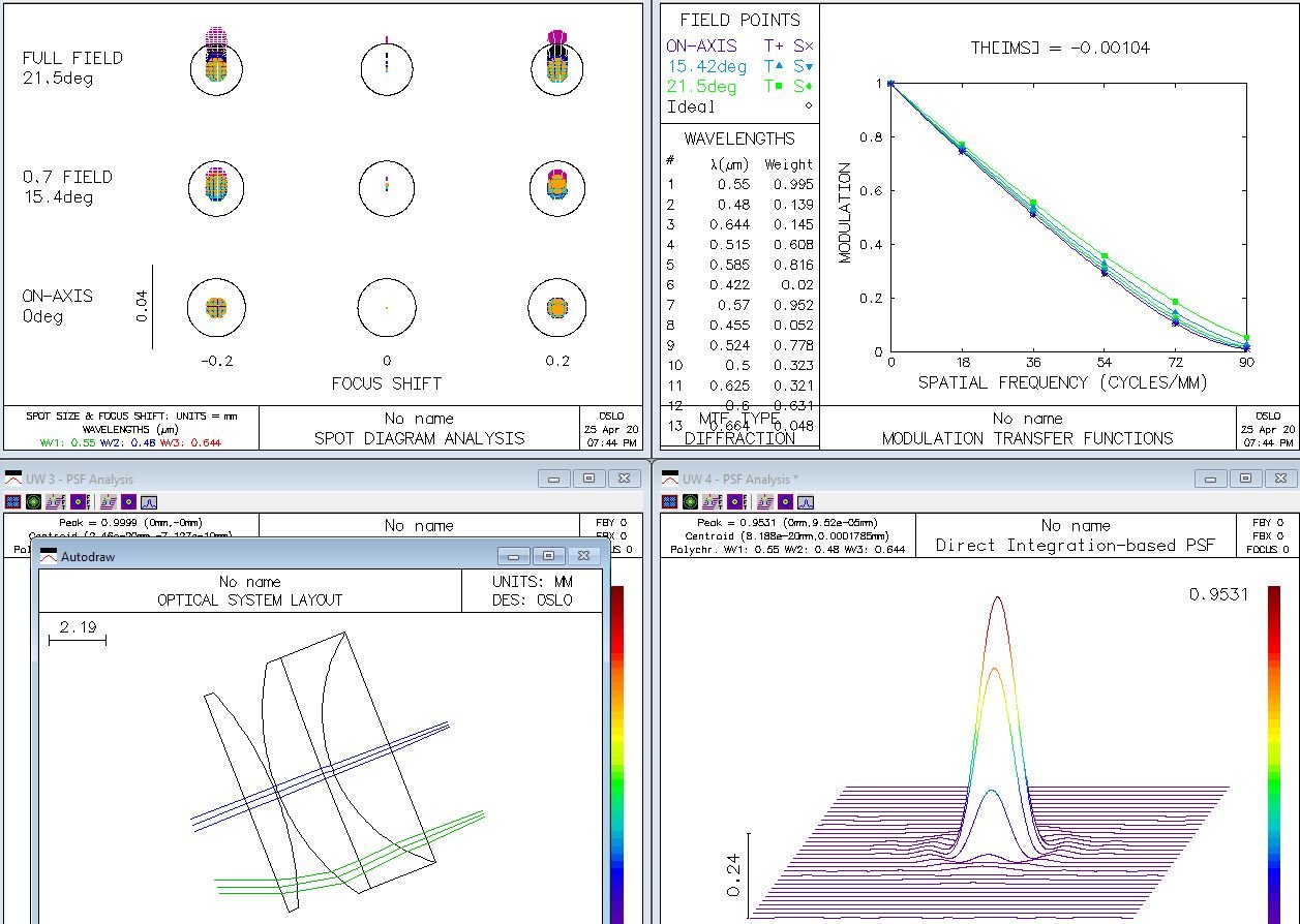 lyl Posté 9 mai 2020 Auteur Posté 9 mai 2020 (modifié) J'ai recherché une meilleur optimisation pour le Clavé et modifié les posts au-dessus. Je comprends l'intérêt de la fabrication des petites focales jusqu'à 3mm, c'est franchement monstrueux vu que le piqué s'améliore sur les petites focales. Reste à pouvoir l'utiliser. Le TV plössl reprend de l'intérêt pour la correction du bord, les 5° extrêmes. Autre point, le Clavé est particulier pour la mise au point, j'ai pu trouver la raison de la phrase de Marcel Clavé "centrer, centrer, décentrer" Je pensais que c'était une simple boutade de l'époque avant qu'il reçoivent le traitement antireflet. En fait la map avec un Clavé se réalise au début du 2eme tiers de champ entre 8 et 15°. Il y a un creux d'astigmatisme compatible avec l'accommodation de l’œil, sous 15-16°, combiné avec la "forte" couleur latérale dans la plage de sensibilité maximale de l’œil. C'est une technique qui est aussi évoqué chez Edmund Optics pour le RKE qui se fait pour celui là plus éloigné vers 70% vers 15° de champ au 2/3 comparativement De plus et pour finir, les Clavé sont optimisés par rapport à la focale. J'ai un 55mm sur lequel je me suis arrachée les cheveux pour comprendre. Le prêt d'un set de Clavé touffu m'a permis de vérifier ce fait. Le 55mm par exemple (il n'a pas besoin du "centrer/décentrer") va ressembler optiquement à ça. Le cercle identifiant 3.4' d'arc, ce qui correspond parfaitement à la résolution hors d'axe de l’œil à cet angle : étoiles ponctuelles même avec la dispersion des couleurs et même si on pointe le regard vers le bord, c'est quasiment impossible à voir de la couleur latérale. De plus il est ultra-flat : un vrai bonheur de confort pour l'observation. Modifié 9 mai 2020 par lyl ajout Clavé longue focale 1 1