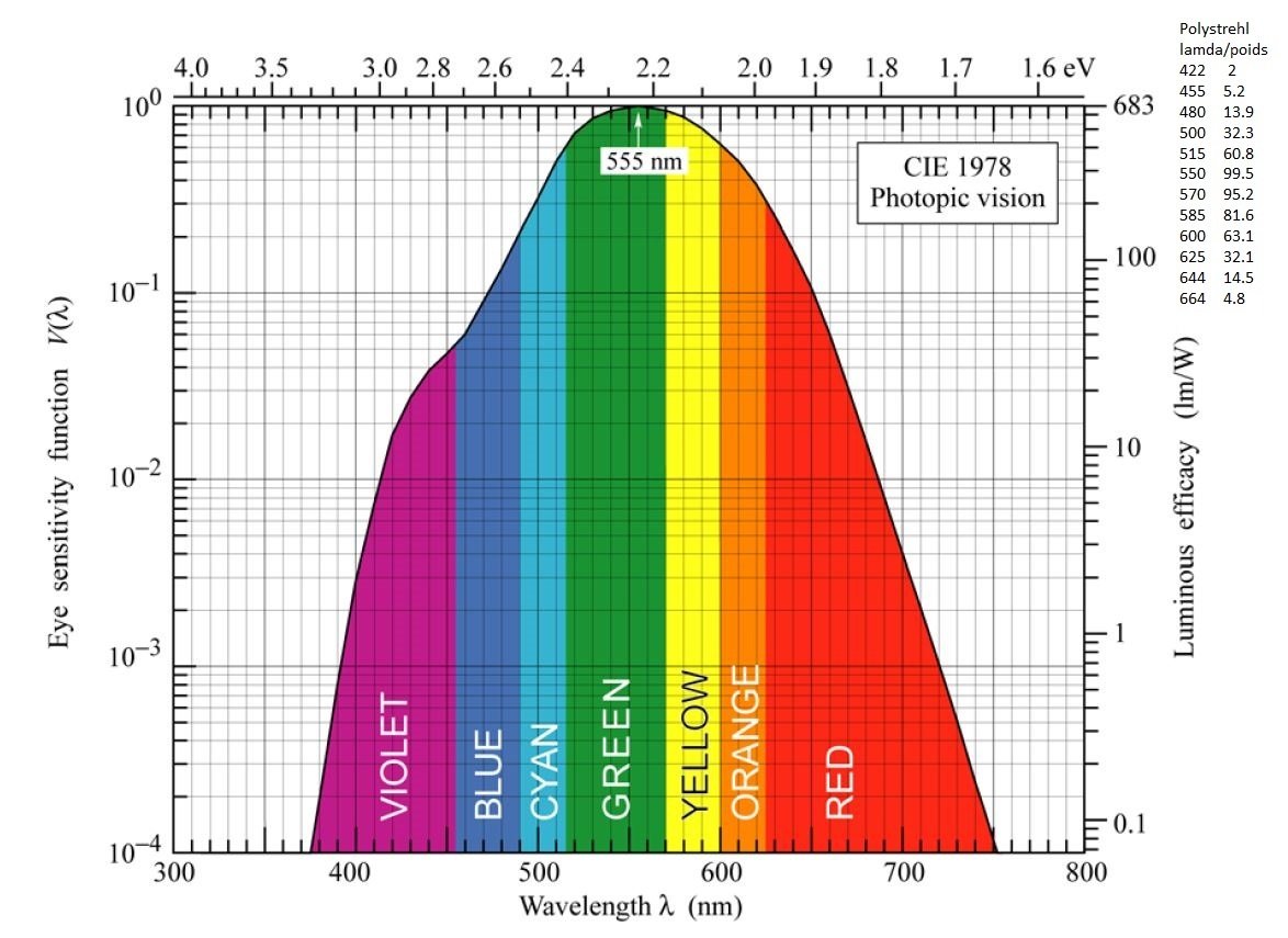 lyl Posté 25 avril 2020 Auteur Posté 25 avril 2020 (modifié) suite de 1) A propos de la référence chromatique. Une observation des planètes c'est plus exigeant que l'observation lunaire, la couleur est de la partie. Voici des informations capitalisées depuis plus de cents ans et qui ont servi à la plupart des concepteurs d'oculaires. Qu'est-ce qu'on regarde ? Des planètes pleines de couleurs qui ont des significations sur ce qui s'y passe. Elles reflètent la lumière solaire. Quelles sont les particularités de l'observateur : sensibilité à la couleur, capacité de discrimination de la couleur, piqué de l’œil/champ On est particulièrement intéressé par la sensibilité photopique et la discrimination des nuances colorées. L’œil est également inconstant en dehors de l'axe comme écrit au-dessus. Il y a la possibilité de tourner l’œil d'une vingtaine de degrés mais surtout la faible zone autour de la fovéa, là ou se trouve son piqué. Sur l'image légendée en allemand (à droite de la courbe rouge) figure une liste de longueur d'ondes et de pondérations. Elle a servi à Takahashi pour concevoir la FS102 et d'autres instruments. Elle sert à établir le "polystrehl", une bonne approximation pour le comportement en visuel. Les courbes ont un peu changées depuis 2017 et le CIE http://www.cvrl.org/ est en train d'adopter la courbe modifiée de "Judd (1951) and Vos(1978)" que voici J'y ai transposé une amélioration de la pondération, très proche de celle de Takahashi qui est ancienne. Evans (en 1974) a compilé les informations et affiné ces plages qui sont de 480 à 500nm et de 570 à 595nm. Avec des pics secondaires à 644nm et 420-425nm suivant les illuminations (mésopique/photopique). Le positionnement des jalons est plus adaptée à notre sensibilité aux teintes, le poids reste celui des mesures effectué par Vos. à suivre ------------------- Le jalon à 524nm est en trop (remplacé par 515) j'enlève Modifié 6 mai 2020 par lyl jalon 524 1 1