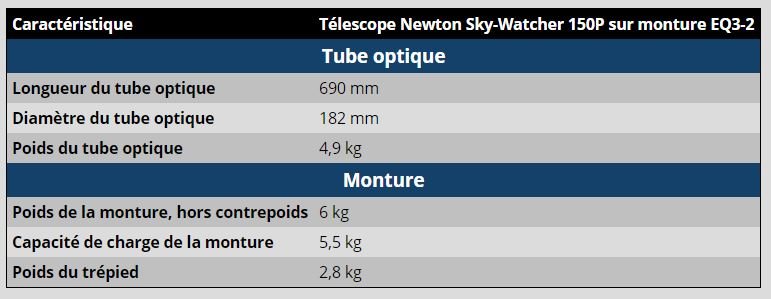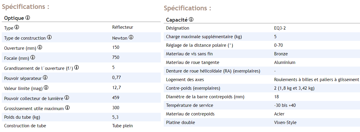 - un newton 150/750 sur monture équatoriale de type EQ/NEQ  3-2 qui pourra ultérieurement être complété (motorisation 1 ou 2 axes, Système GoTo,, etc)