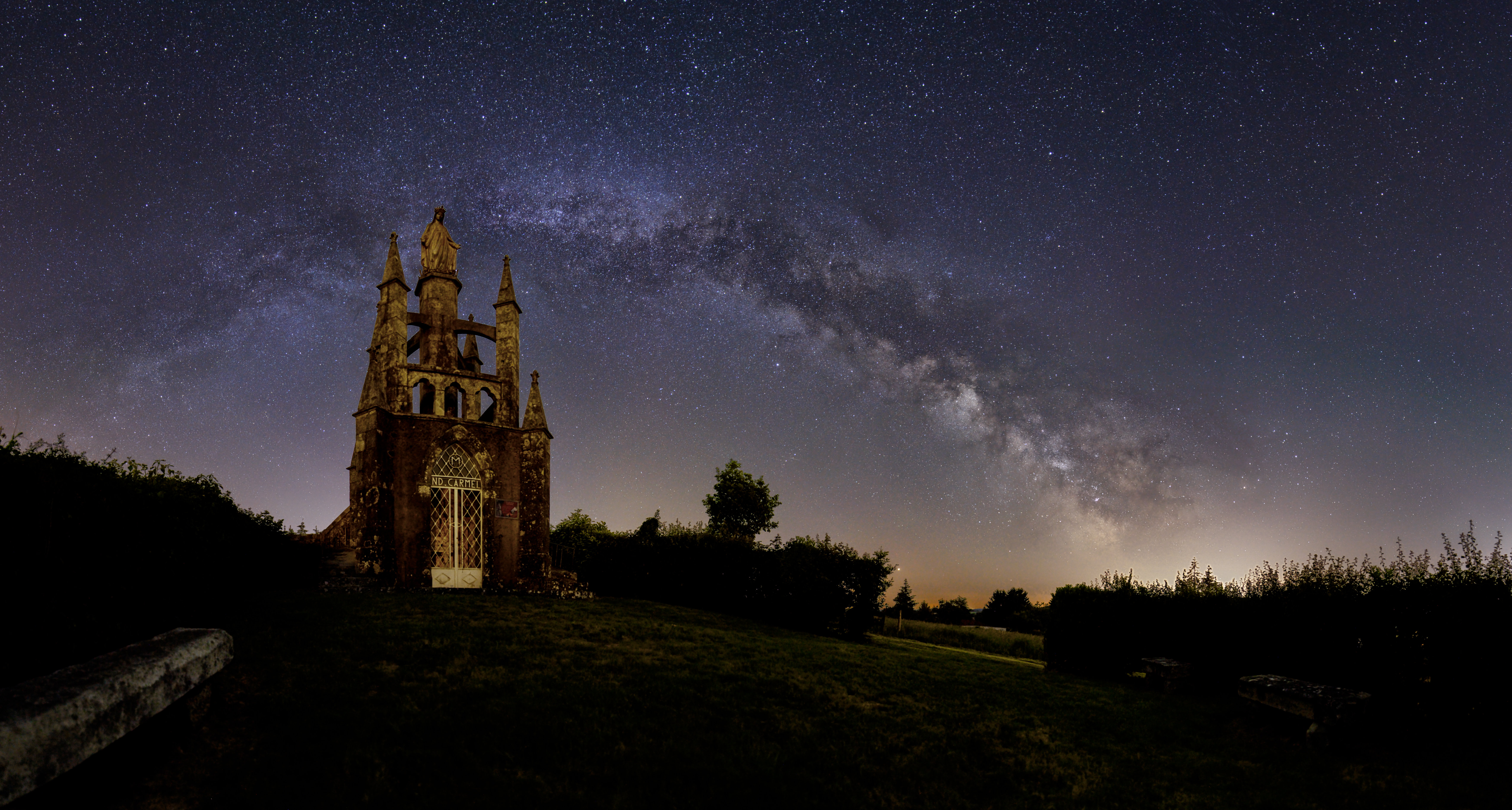 Panoramique arche de Voie Lactée autour d'une petite chapelle