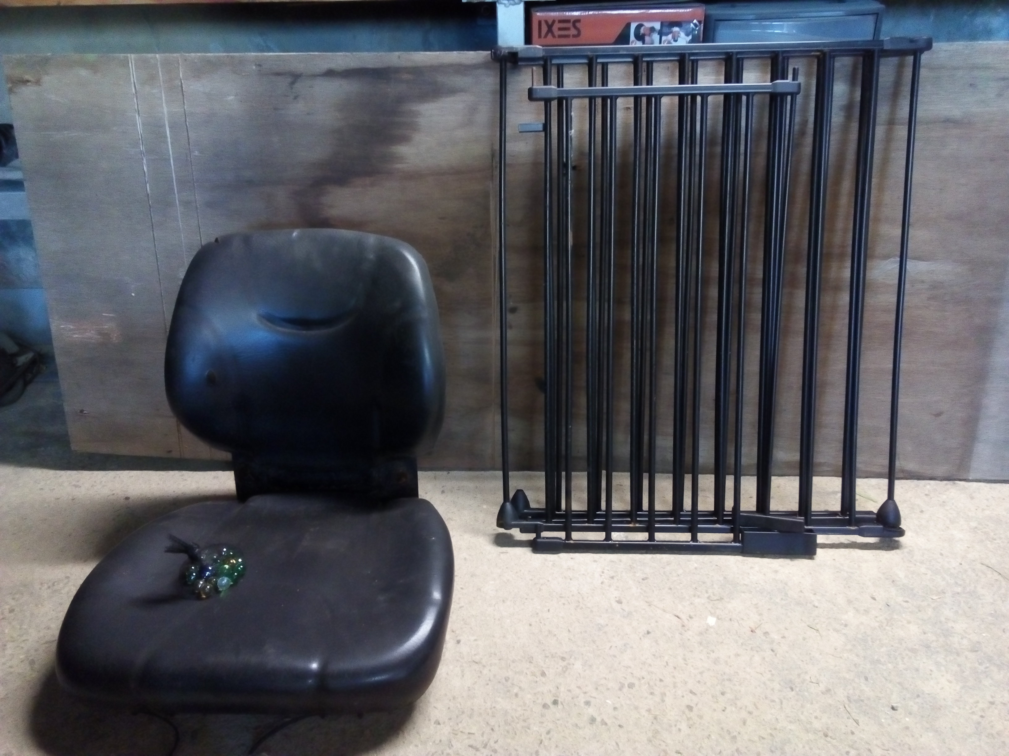 Un siège de tracteur tondeuse pour JMD, la première pièce du Go To! Une barrière de sécurité cassée, les profilés pourront servir je pense pour la monture des jumelles, et un bout de contreplaqué.