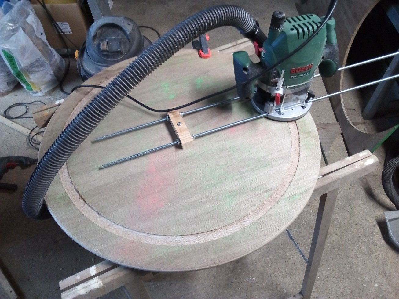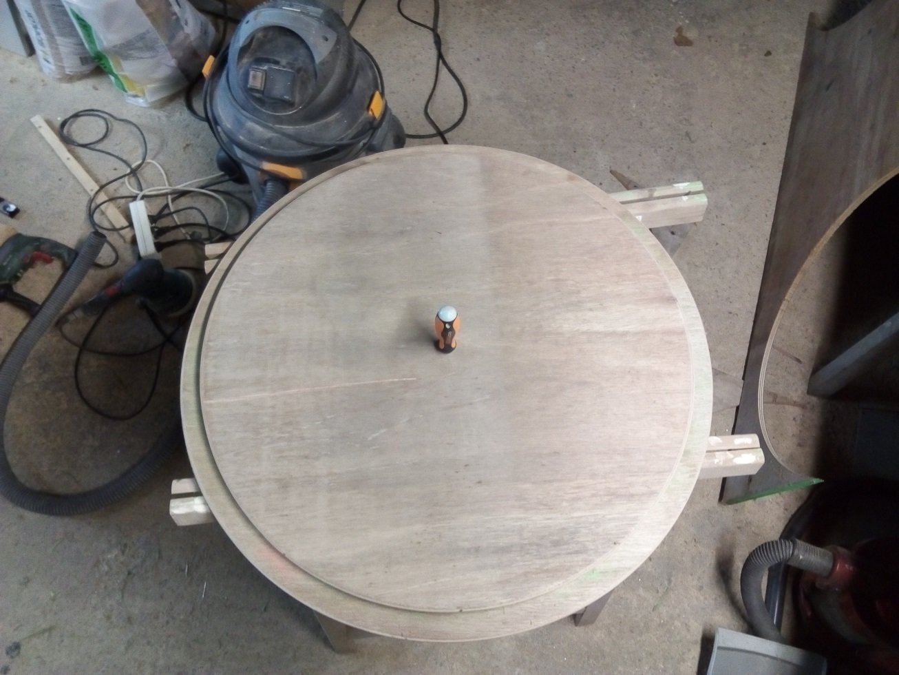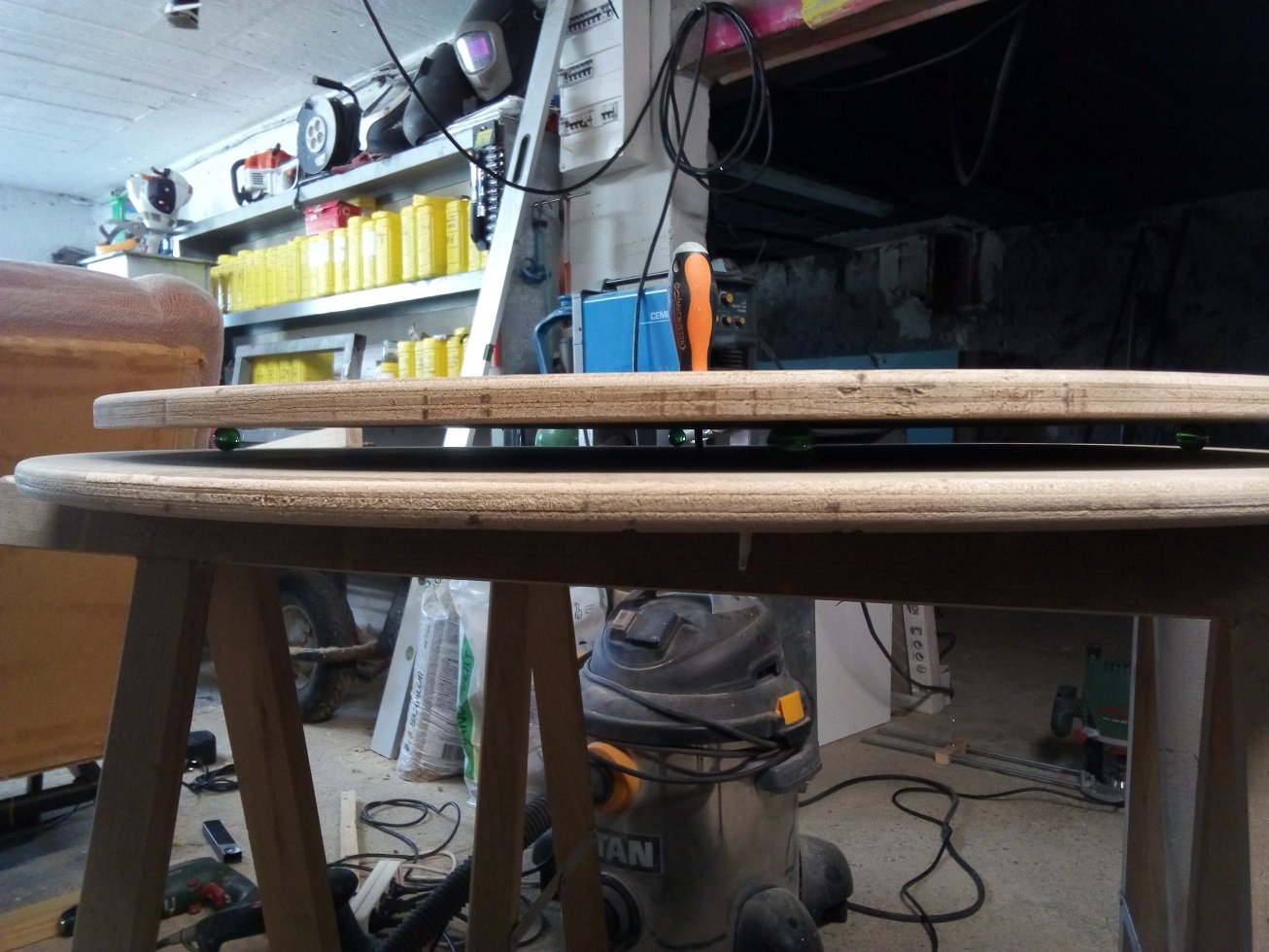 Une fois assis, en prenant un appuis extérieur pour lancer la rotation, on arrive presque à un tour complet, Je pense que ça va aller, mais je me demande si avec le temps le bois ne va pas se tasser avec le poids, j'envisage de remplir la rainure de vitrificateur et de laisser imbiber plusieurs jours, puis retirer l'excédant pour laisser sécher, je pense que ça augmenterai la dureté du bois. Et pourquoi pas une couche de résine époxy ensuite, il m'en reste d'une autre bricole.