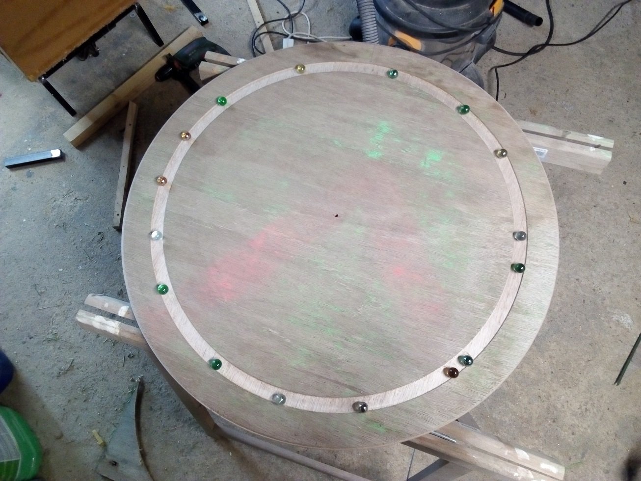 Il faut que ça soit simple et de faible coût, le principe pour le support au sol, un plateau en bois dans lequel je ferais un cercle à la défonceuse, formant une rainure pour accueillir des billes en verre (pas cher, pas d'oxydation, et je pense assez solide avec la répartition), un deuxième plateau similaire par dessus et j'aurais une sorte de roulement horizontal.