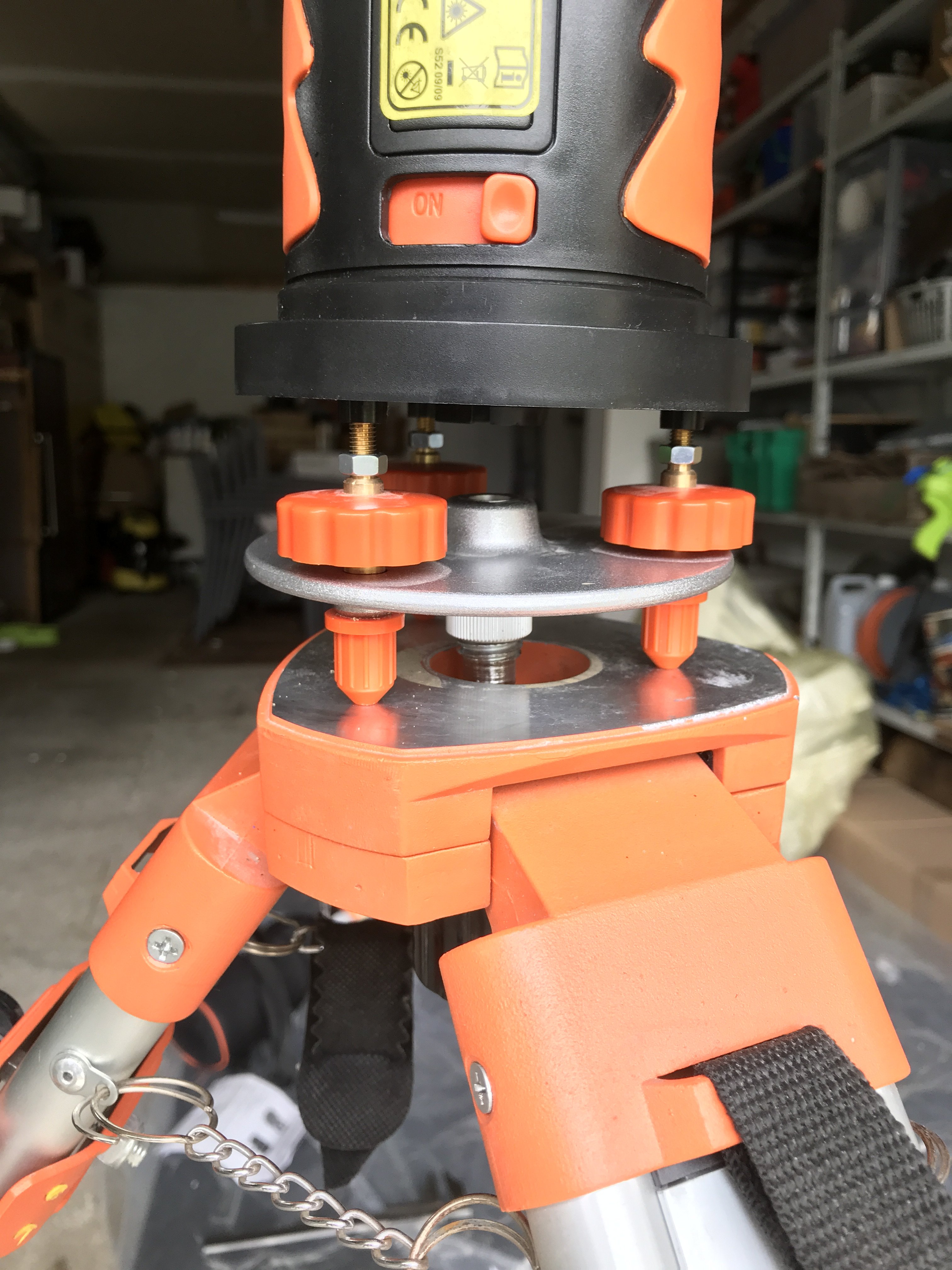 la vis du trépied se visse dans la plate-forme métallique, qui elle-même est vissée dans le niveau laser avec 3 vis, qui servent de réglage fin de la planitude (niveau à bulle sur le dessus du laser)