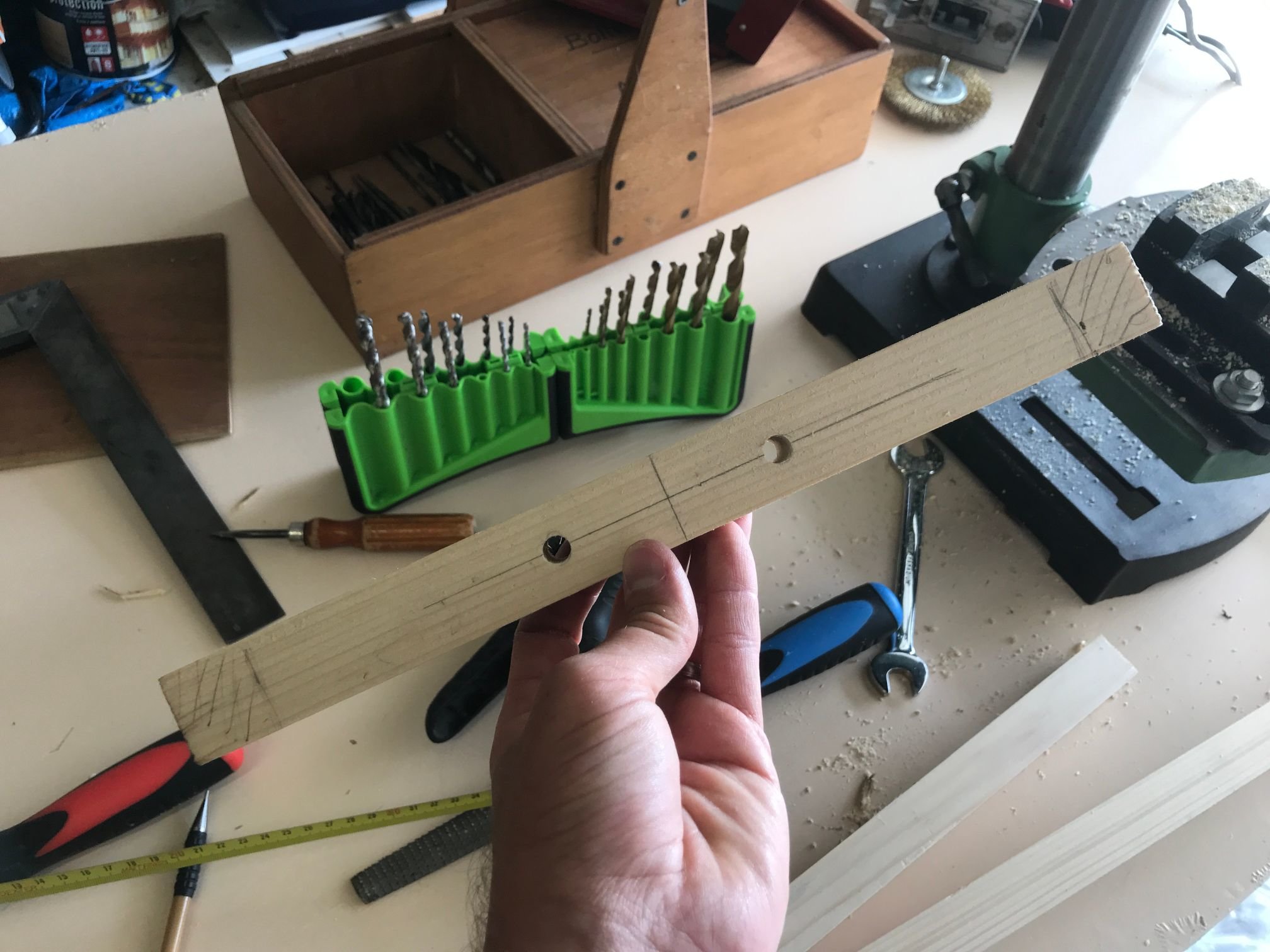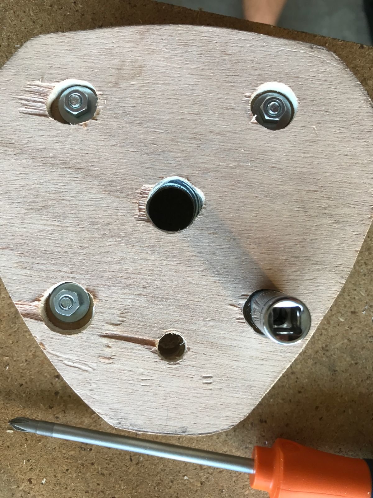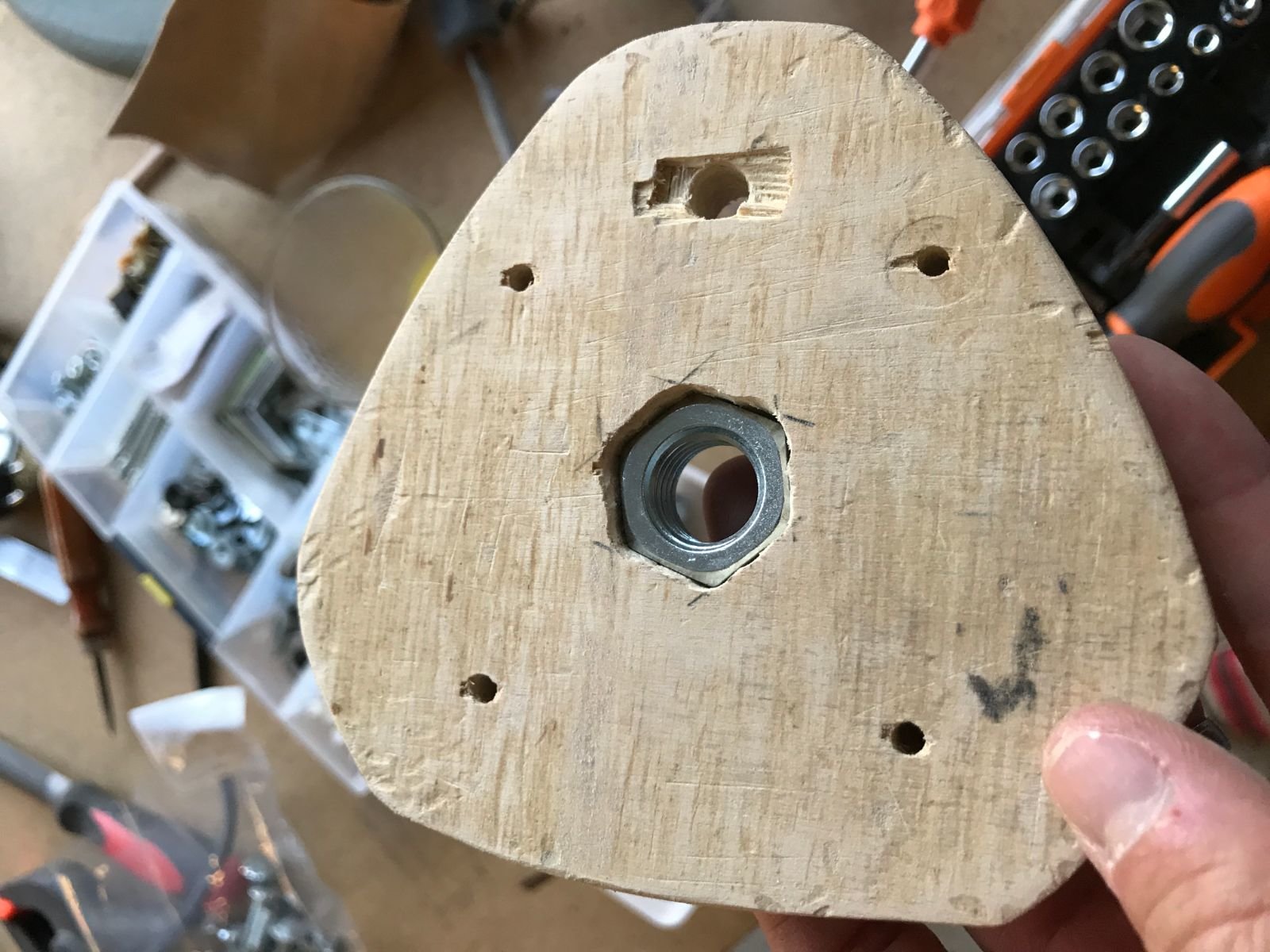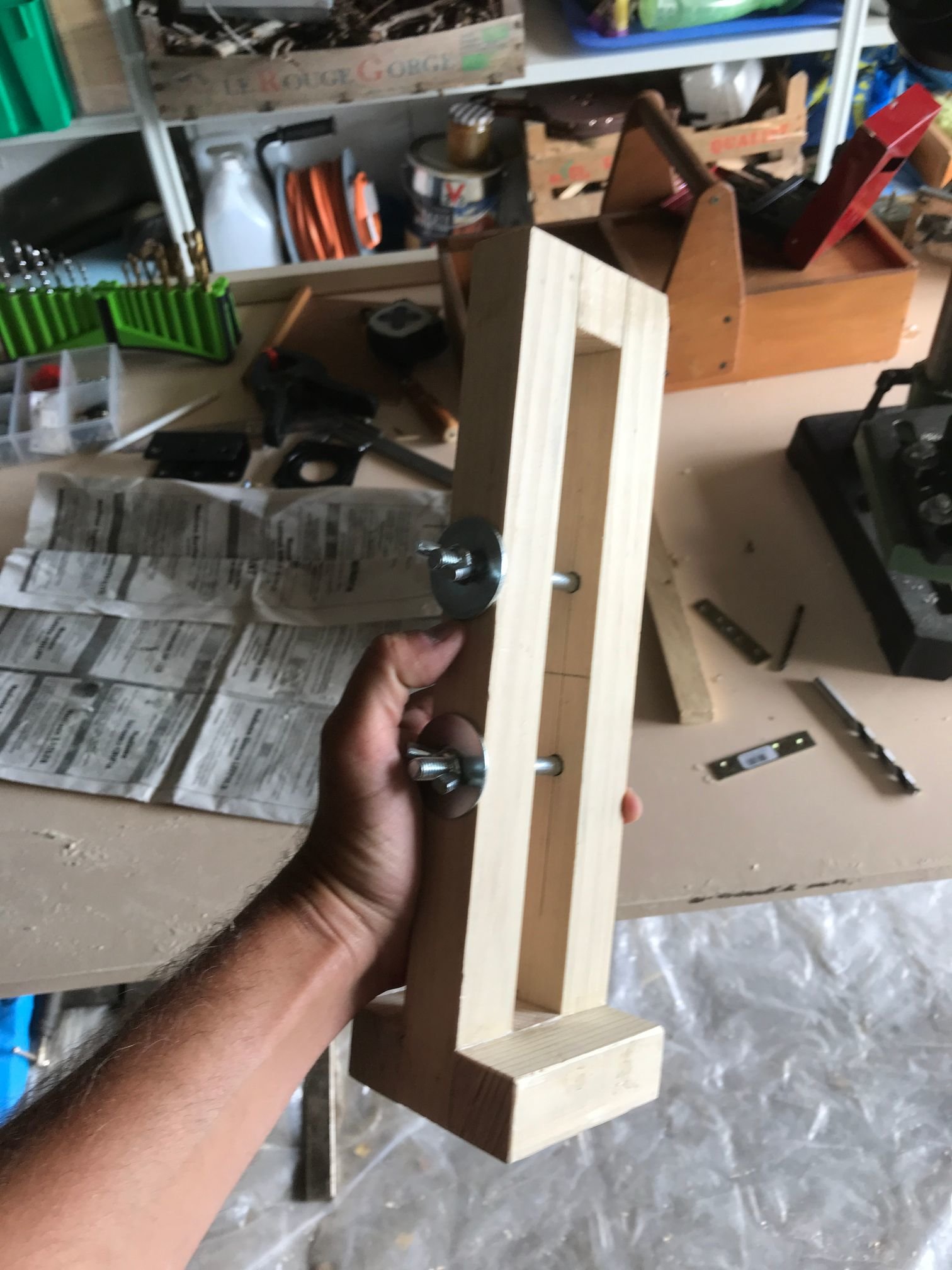 Je l'ai repercé (merci ma nouvelle perceuse colonne, j'aurai rien fait sans elle!) pour pouvoir y visser des poignées (des chutes de cylindre en bois, à améliorer plus tard si je trouve des poignées plus sympas)
