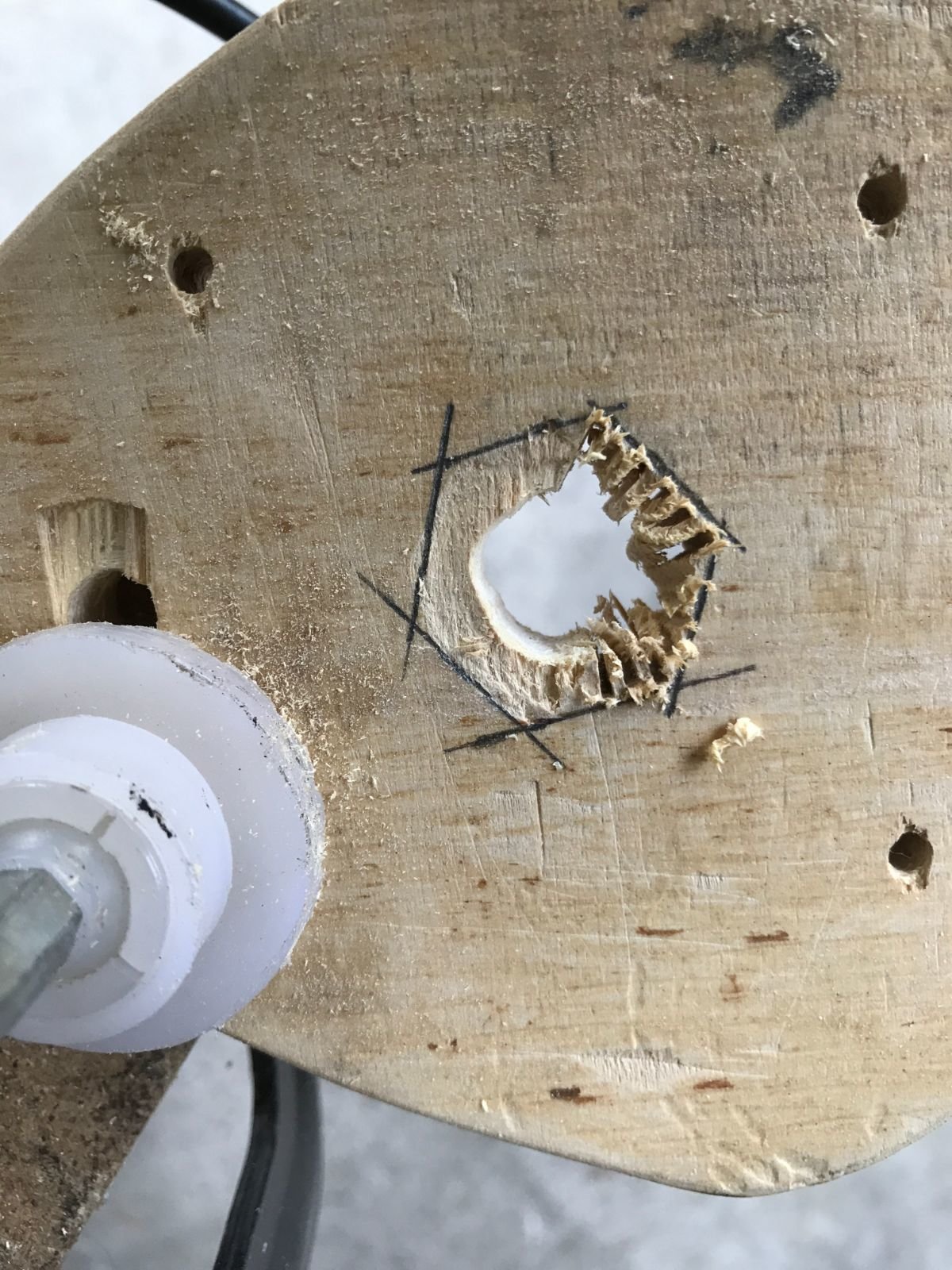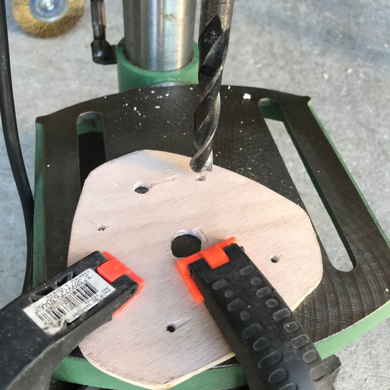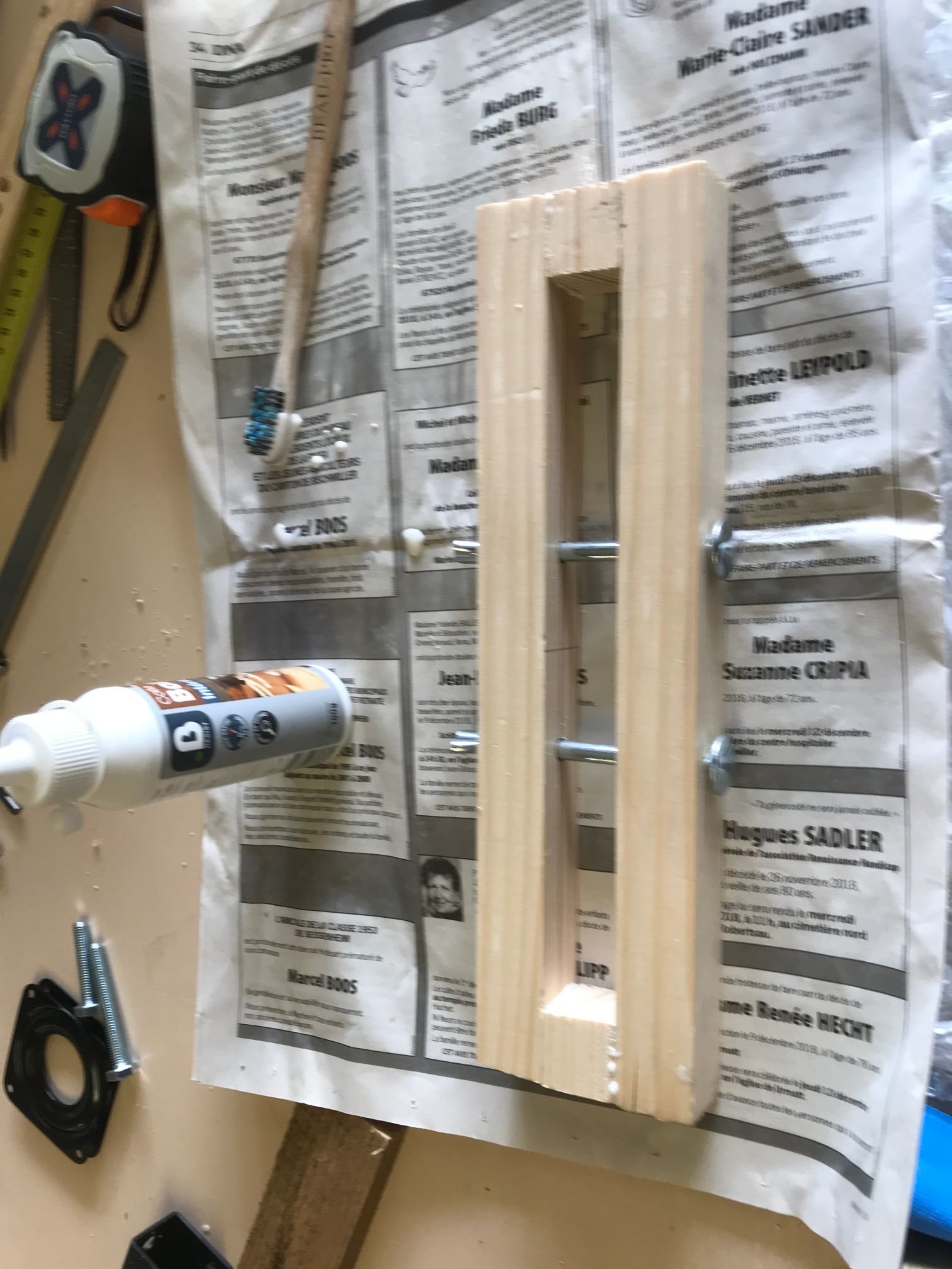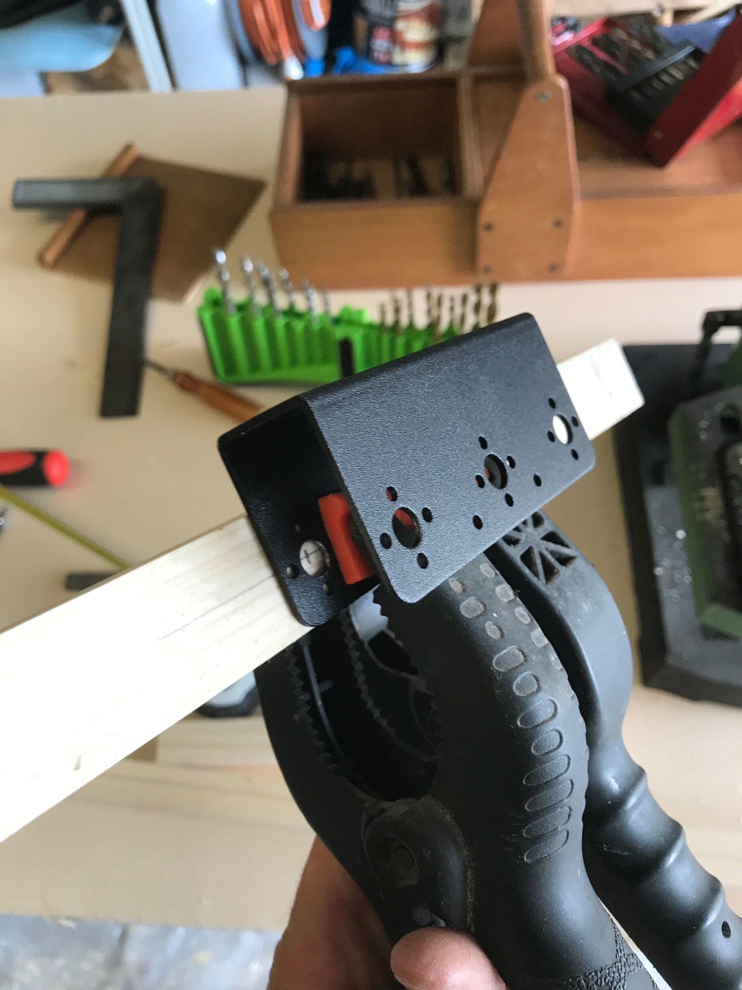 Je l'ai repercé (merci ma nouvelle perceuse colonne, j'aurai rien fait sans elle!) pour pouvoir y visser des poignées (des chutes de cylindre en bois, à améliorer plus tard si je trouve des poignées plus sympas)