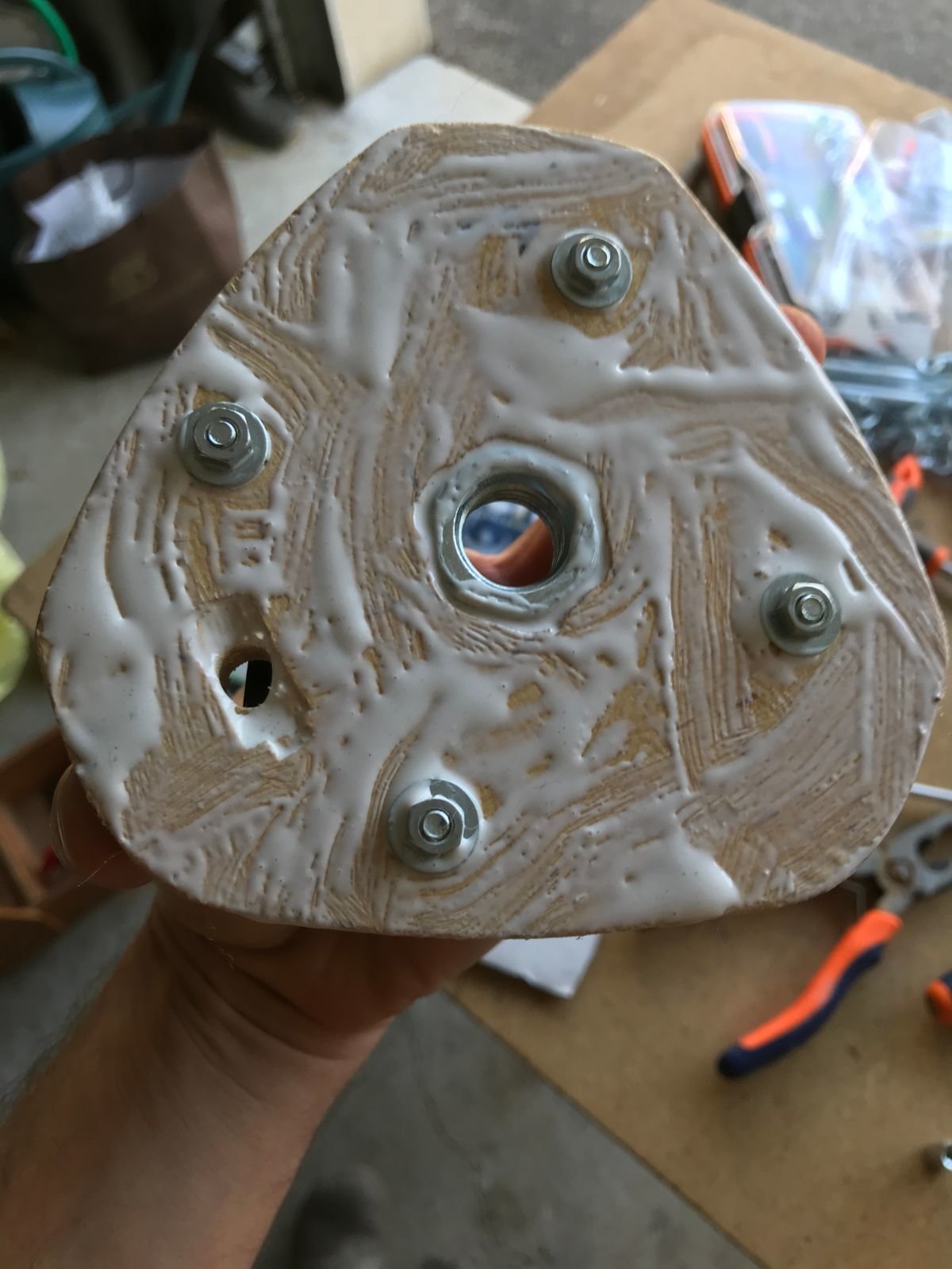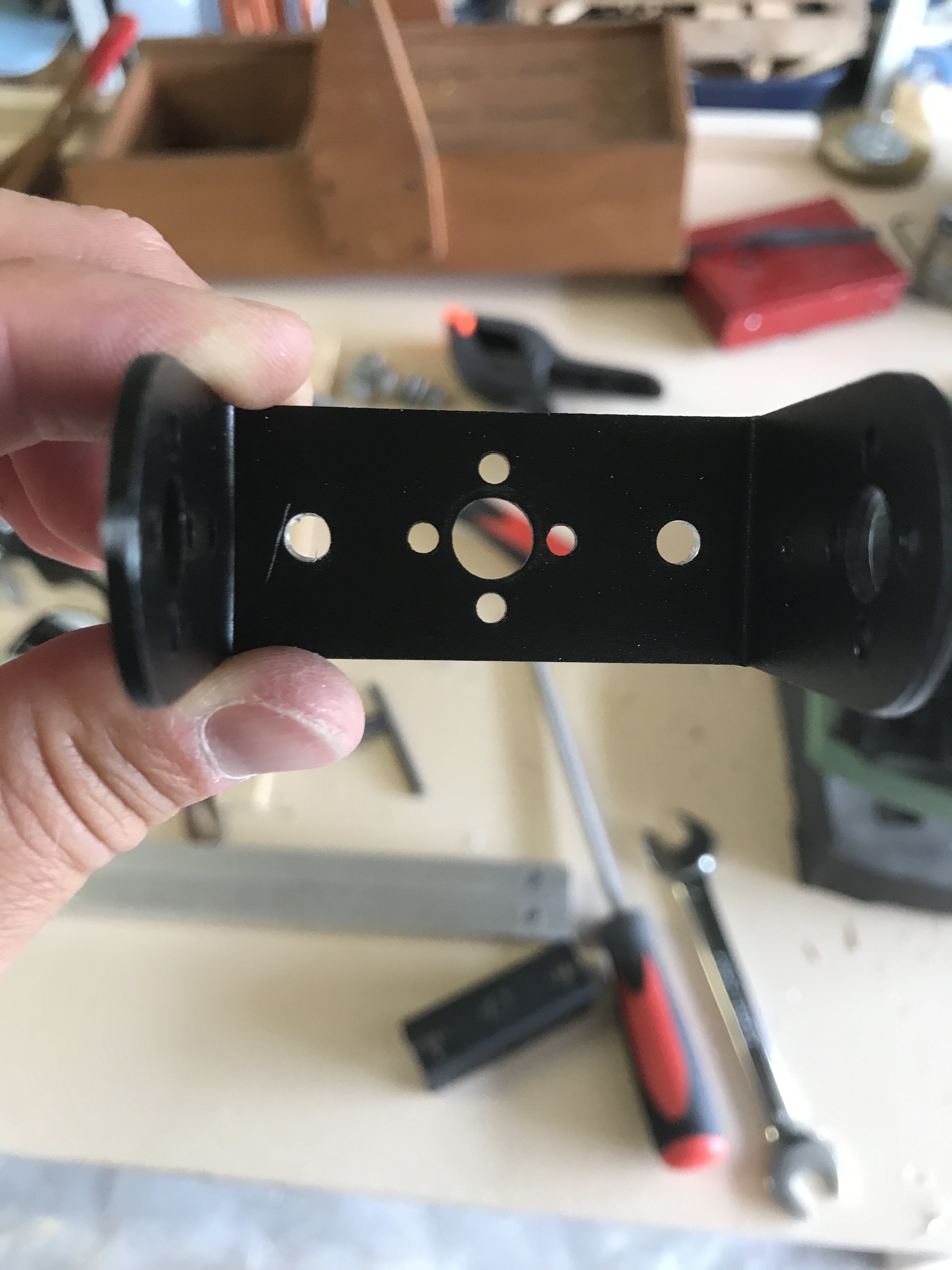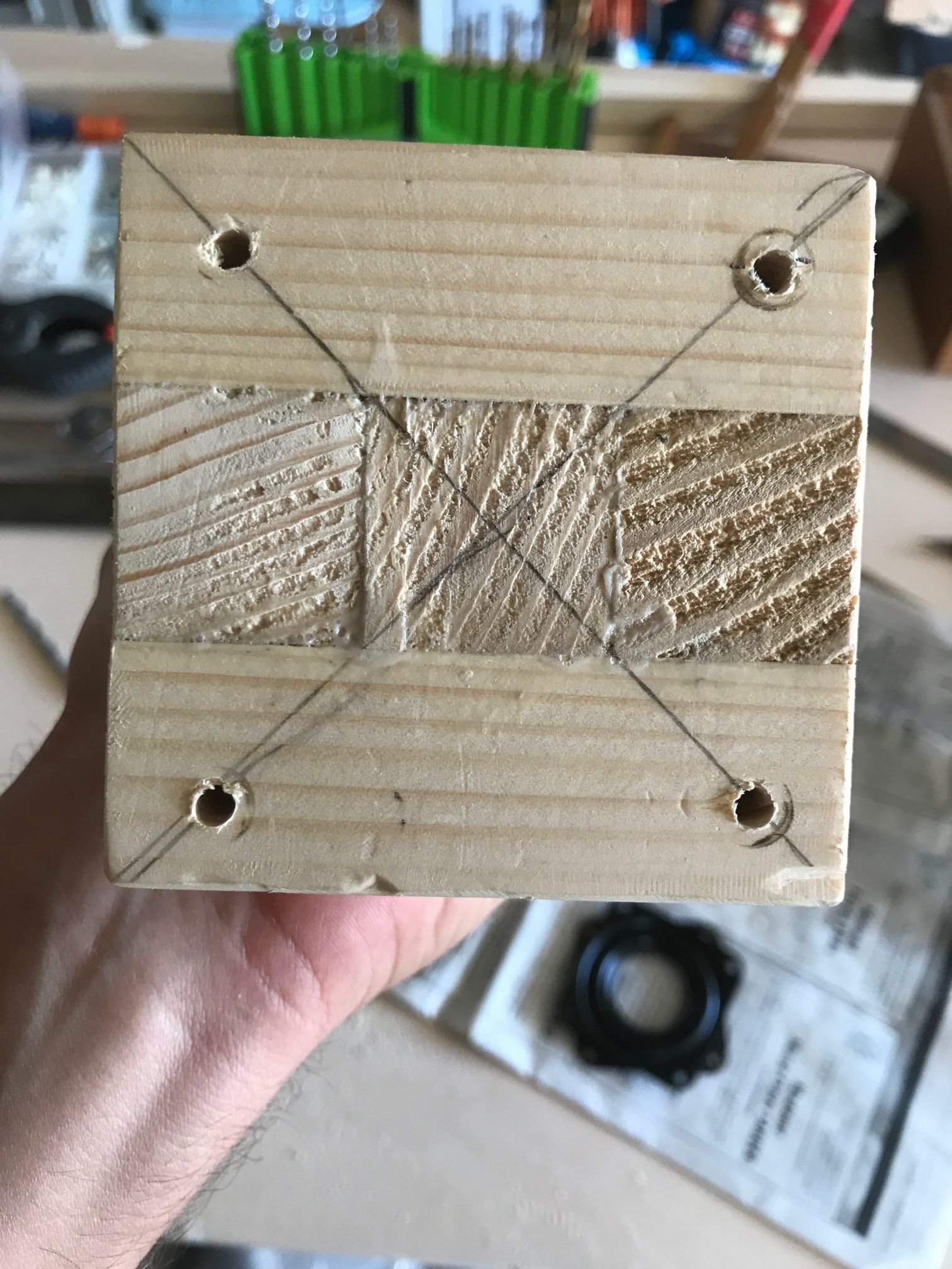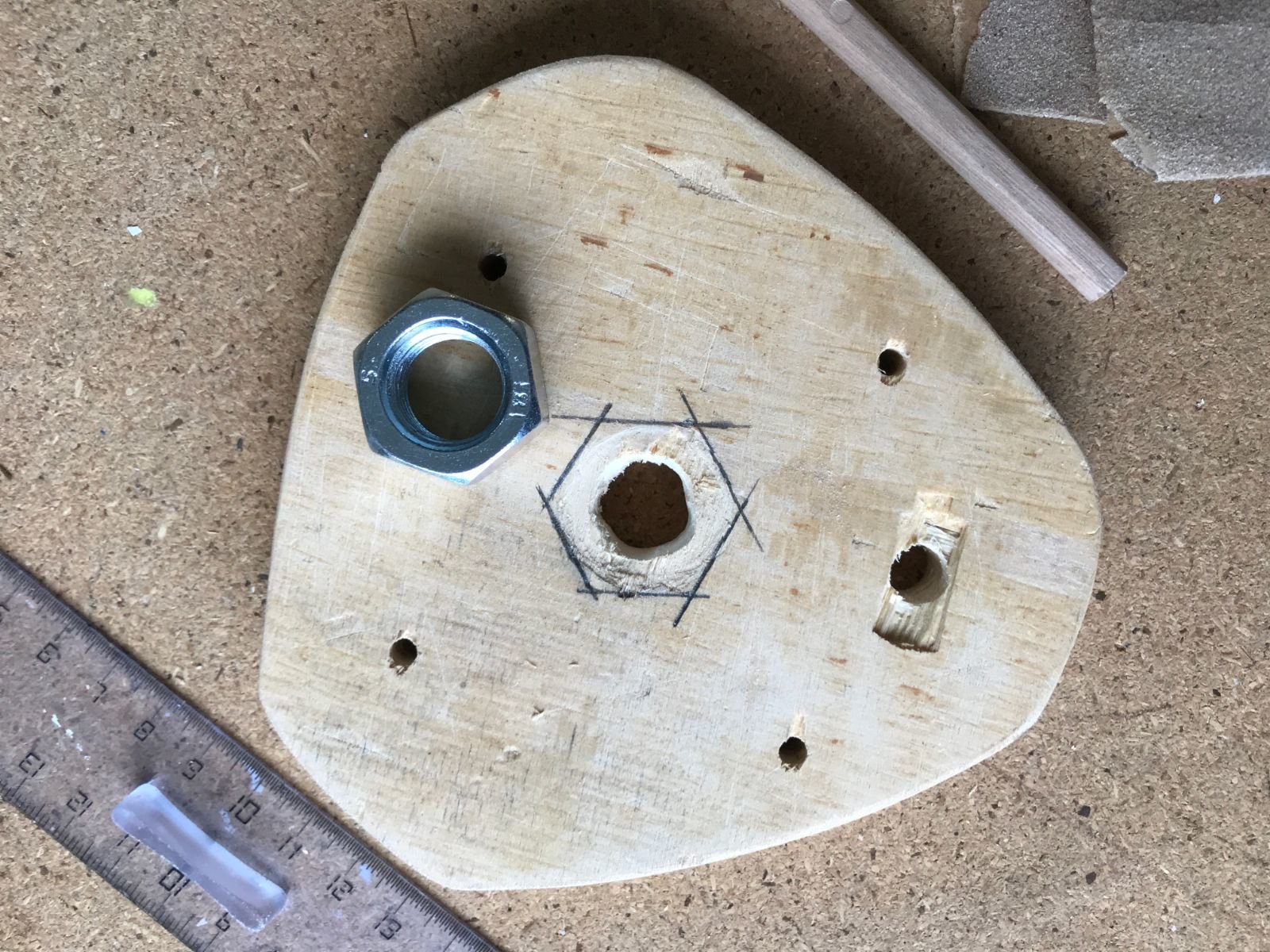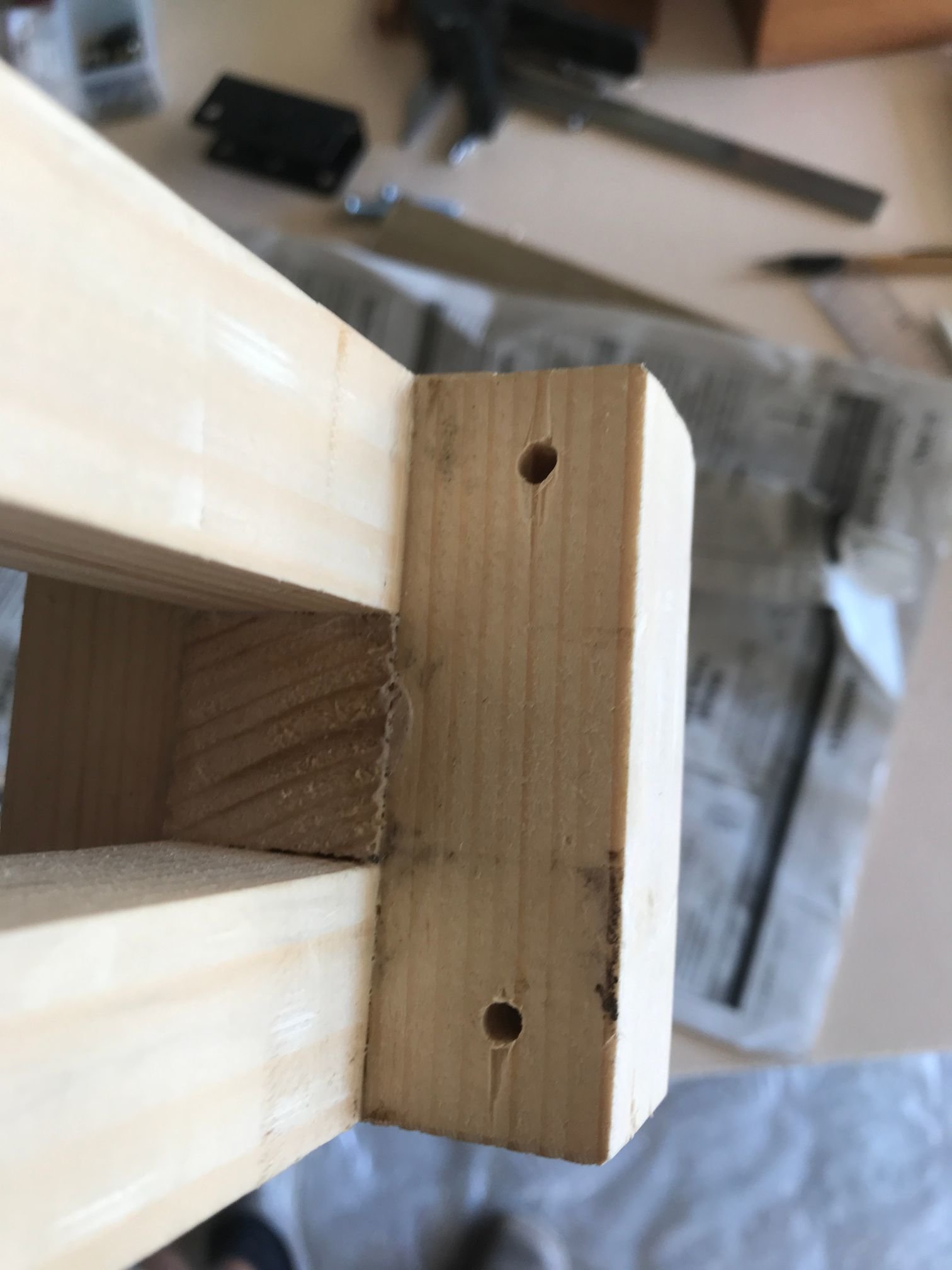 Je l'ai repercé (merci ma nouvelle perceuse colonne, j'aurai rien fait sans elle!) pour pouvoir y visser des poignées (des chutes de cylindre en bois, à améliorer plus tard si je trouve des poignées plus sympas)