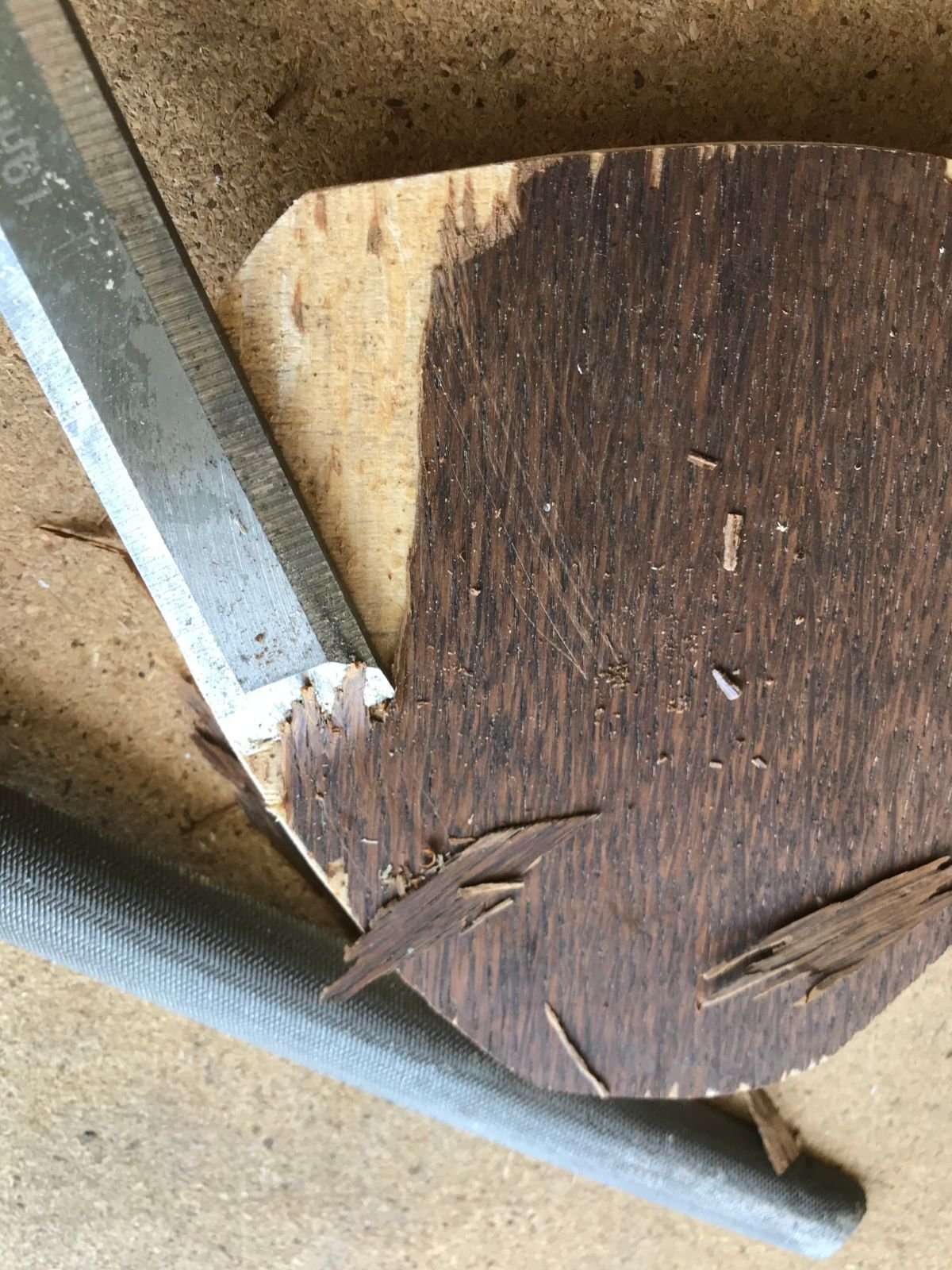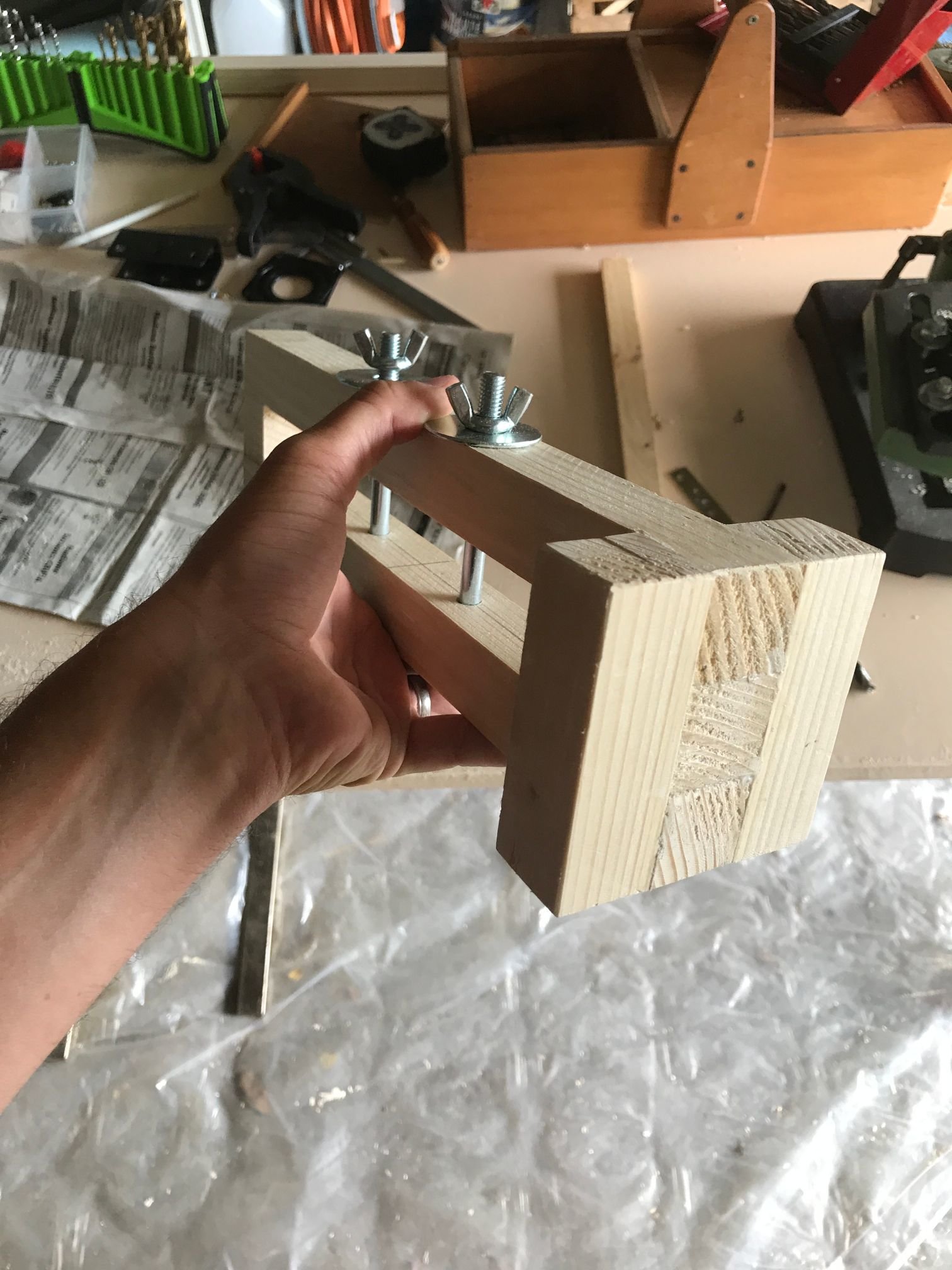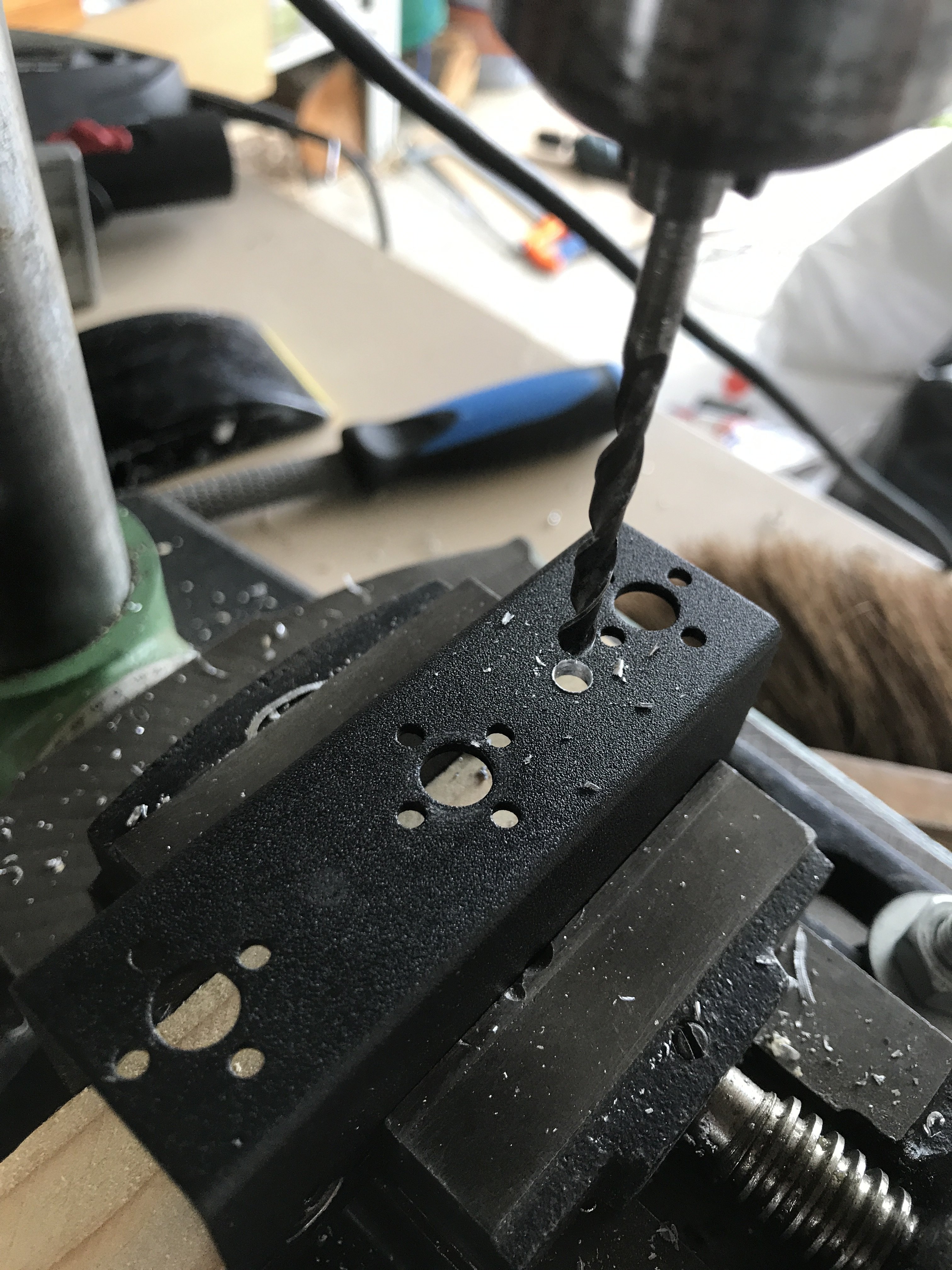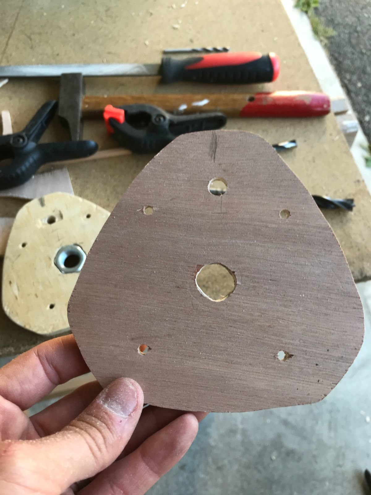 Je l'ai repercé (merci ma nouvelle perceuse colonne, j'aurai rien fait sans elle!) pour pouvoir y visser des poignées (des chutes de cylindre en bois, à améliorer plus tard si je trouve des poignées plus sympas)