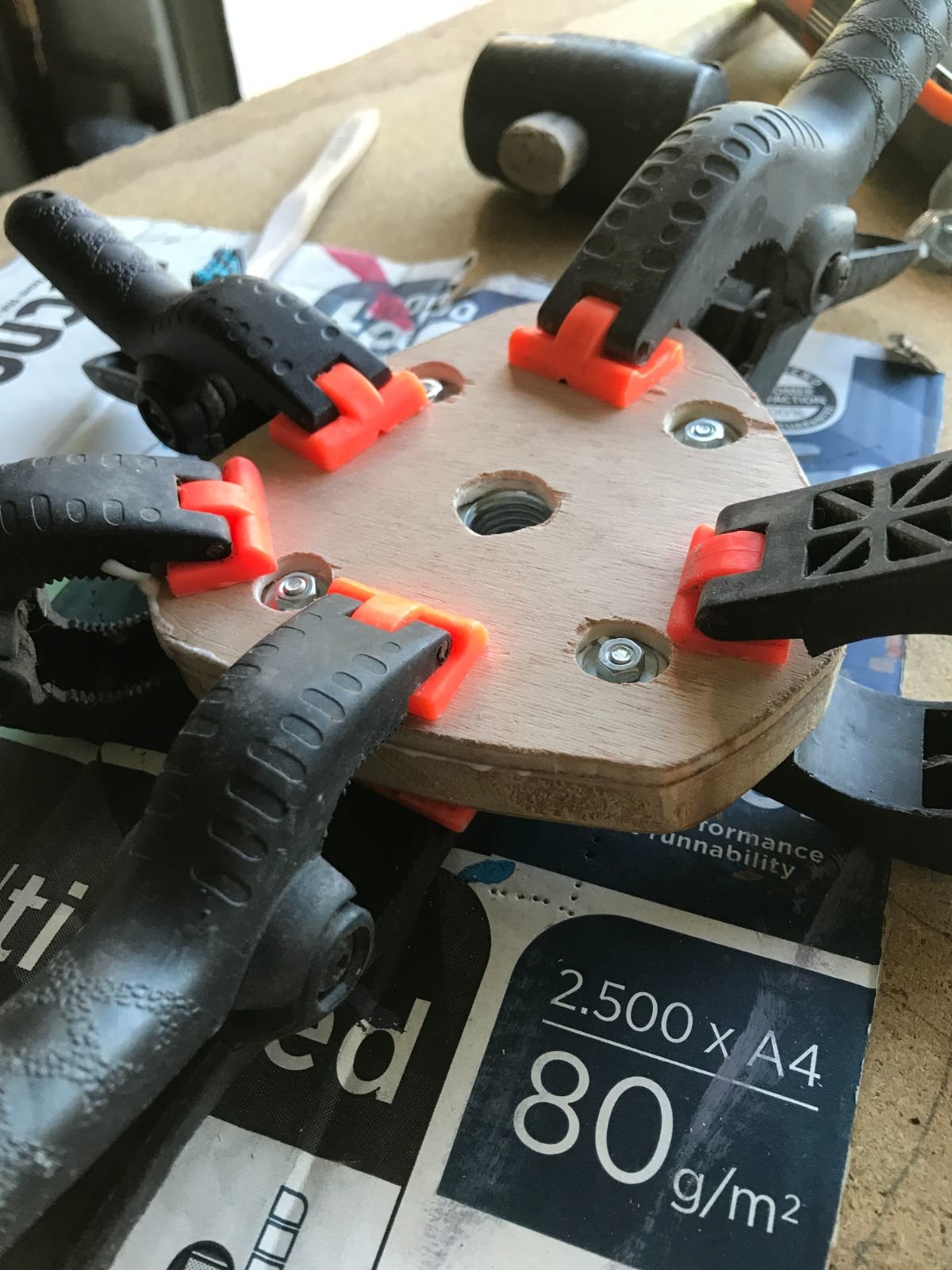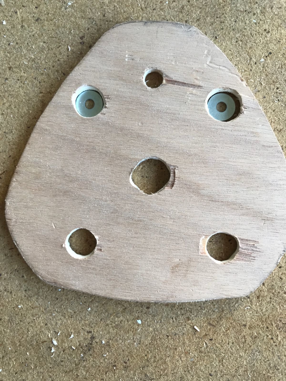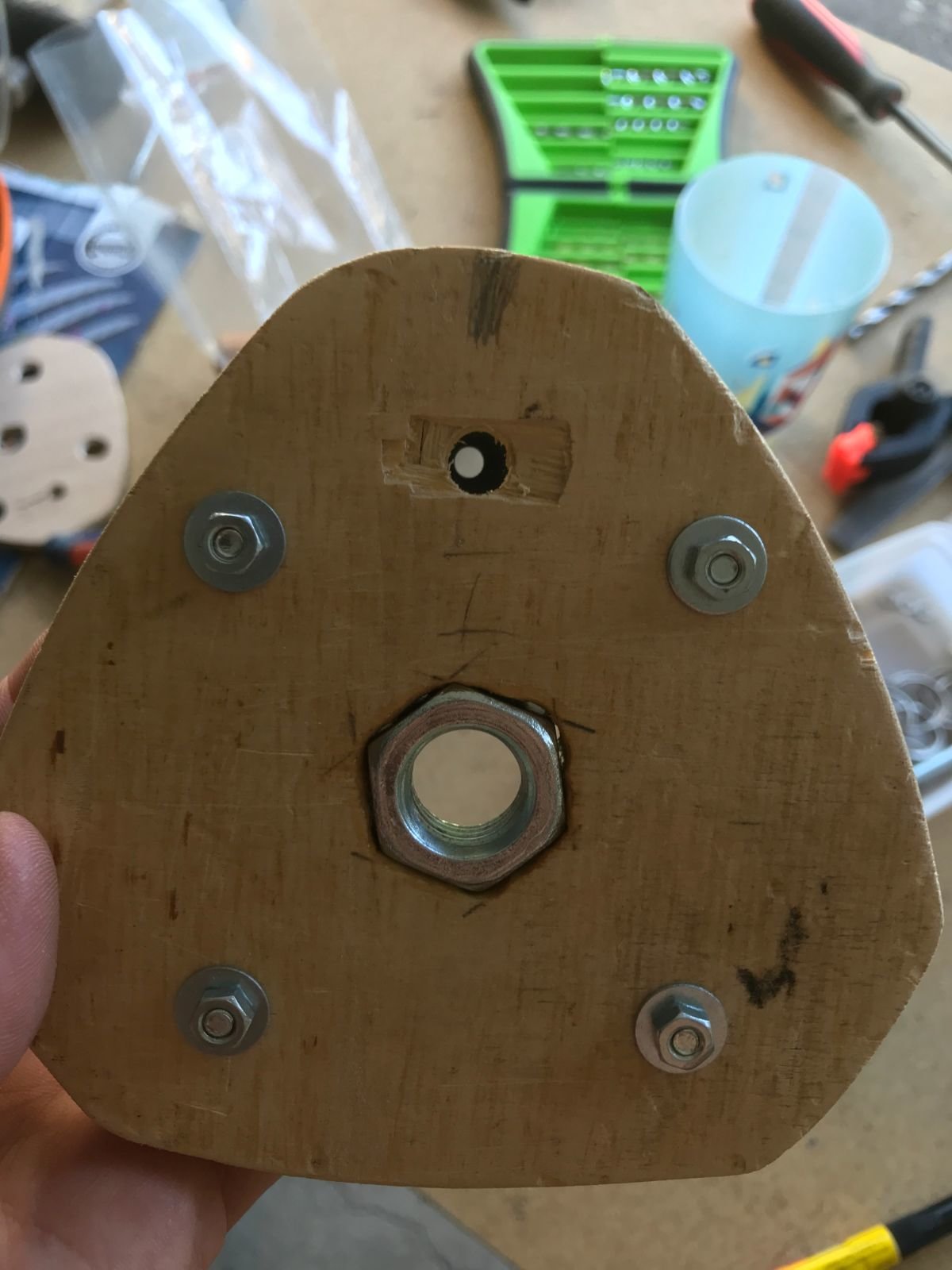 je pense maintenant percer 3 trous sur le dessous d'une plaque de bois un peu épaisse, y emprisonner les 3 petits écrous de 5mm, pour reformer le même type de système que le dessous du niveau laser