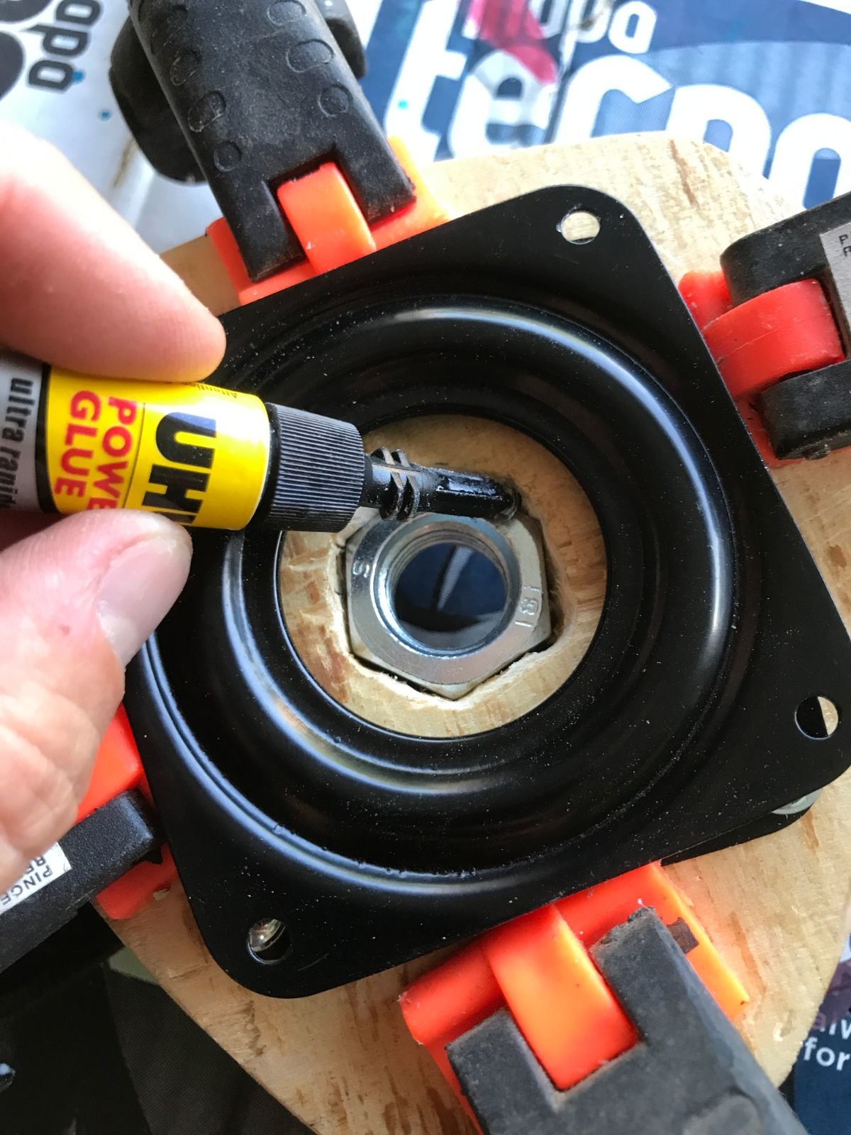 Il aurait peut etre fallu assembler les poteaux et les tubes avant de coller la base, mais ça aurait posé bien d'autres soucis pour la base carrée et le montage sur le roulement à billes alors pas de regrets !
