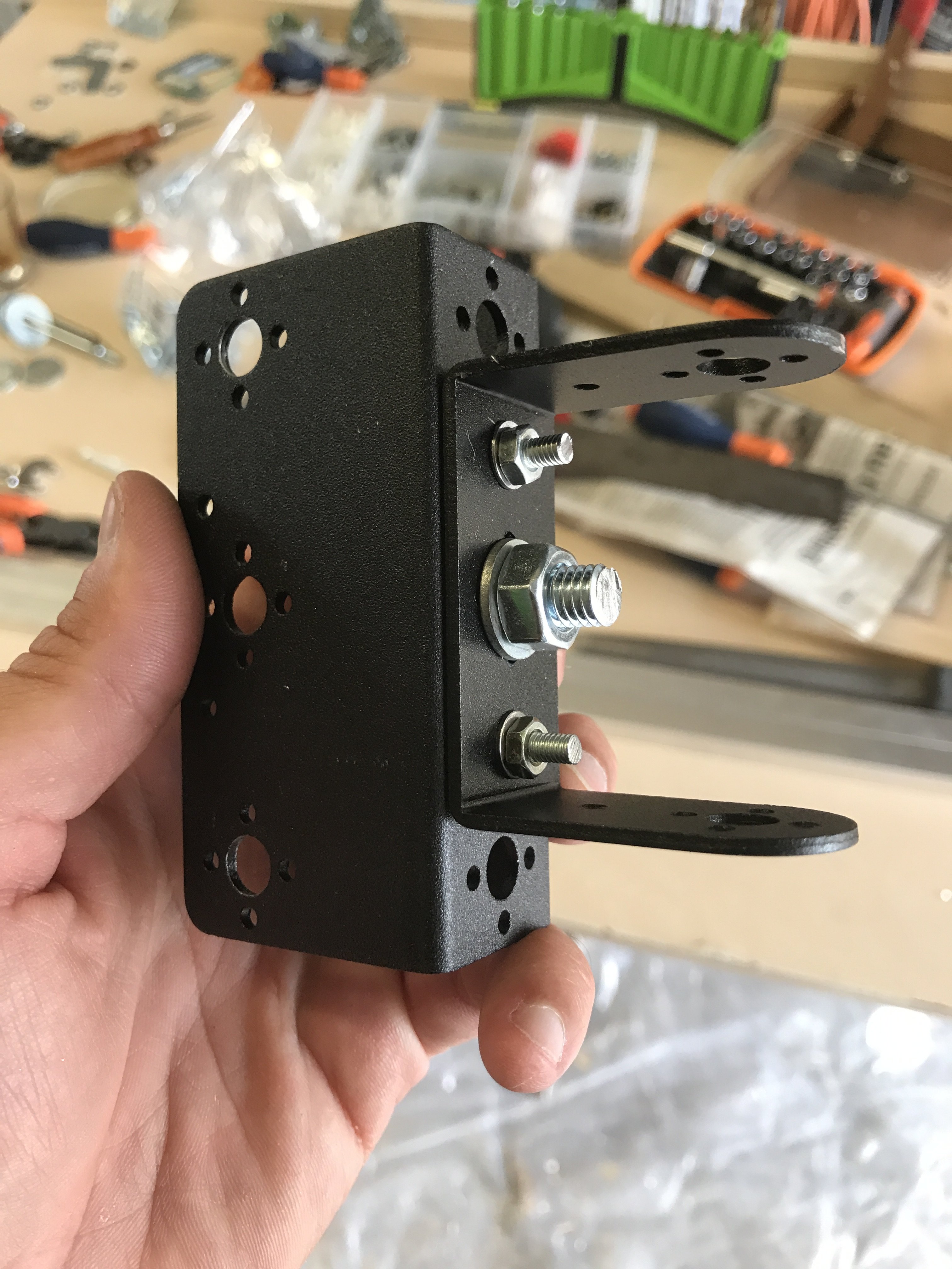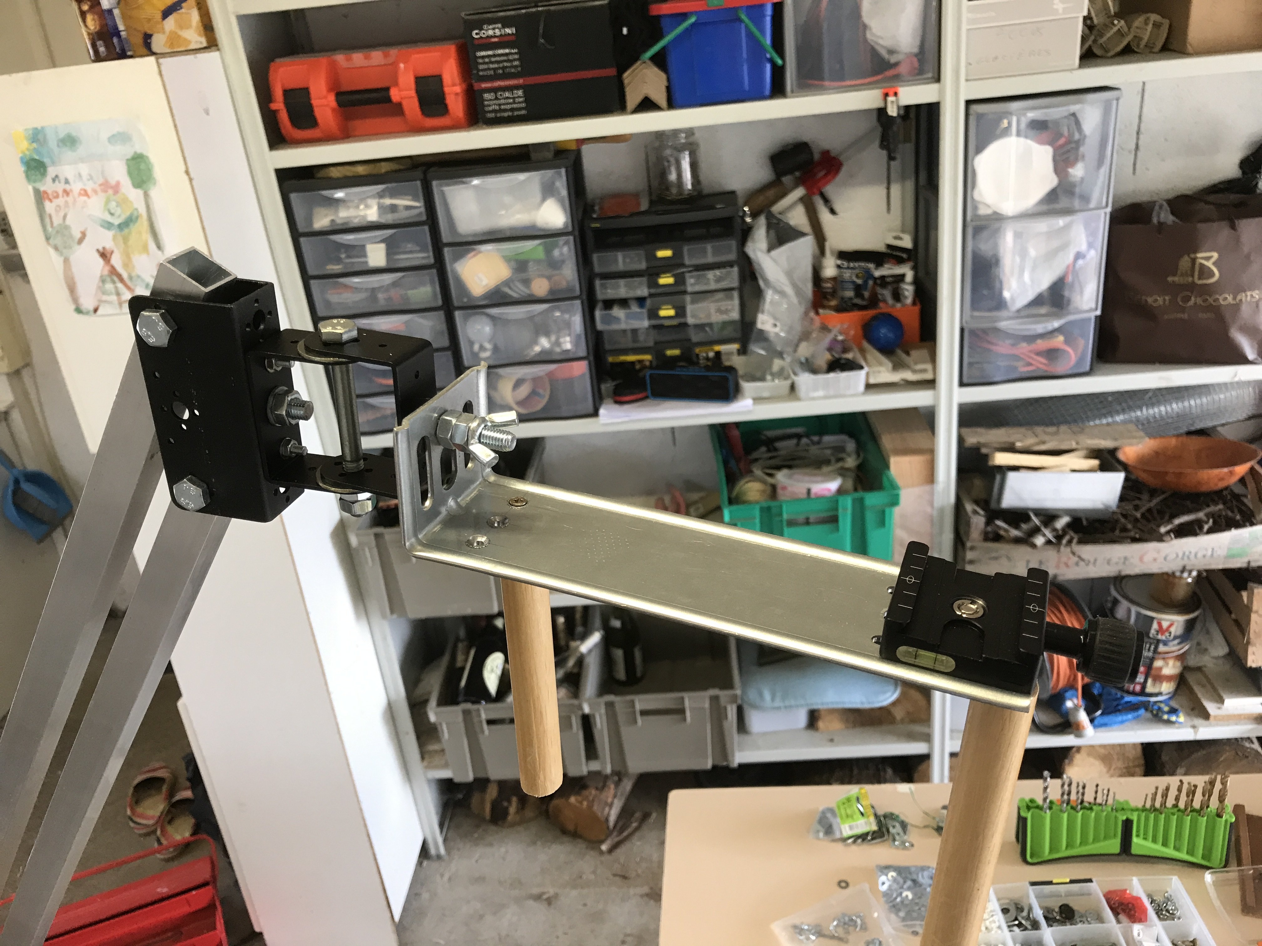 mais faut que je trouve comment faire tourner le support en L / qu'il reste en position même chargé avec les jumelles / que ça se dévisse pas avec un système moins "bancal"
