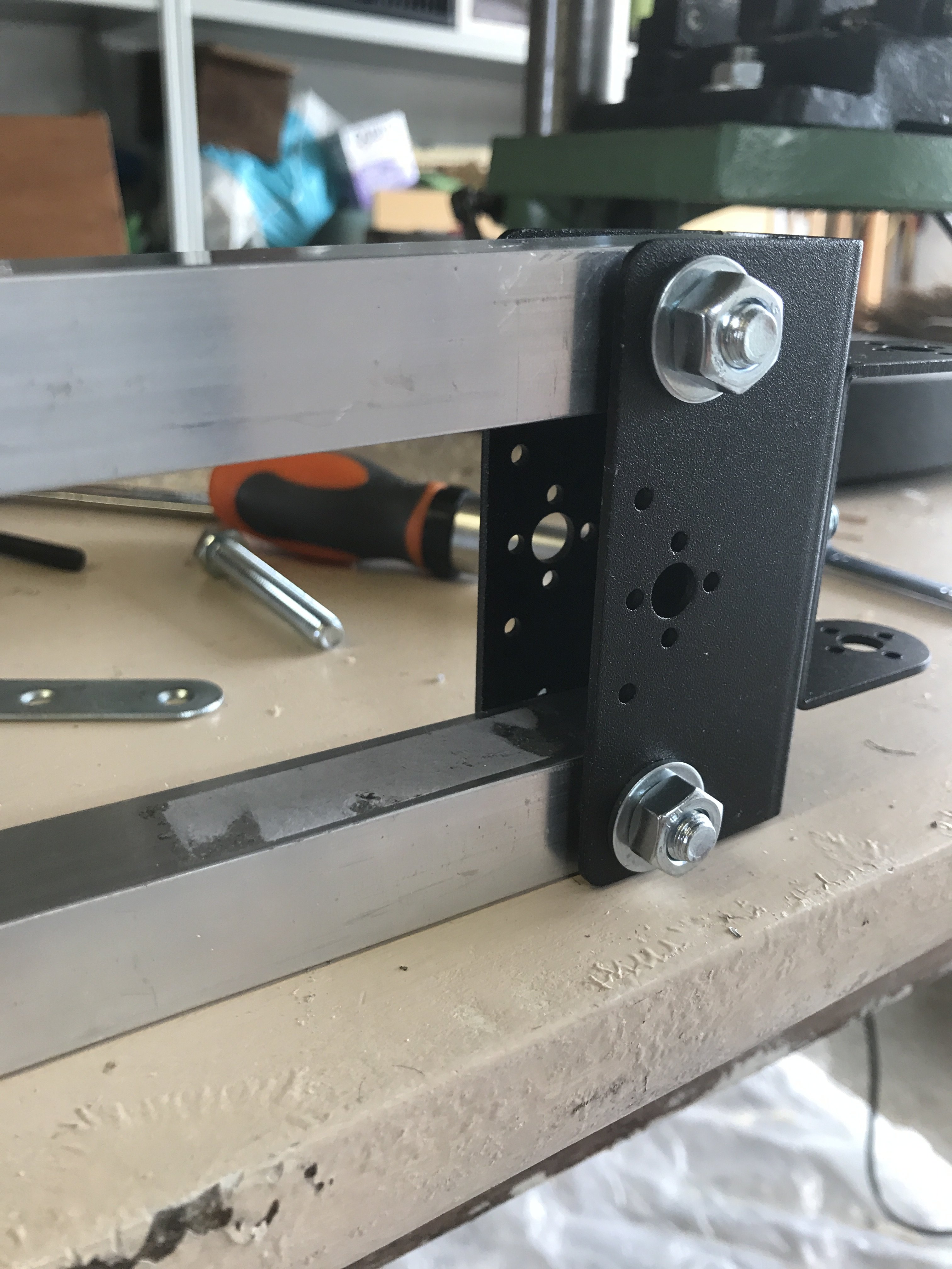 ensuite visser sur cette "plaque tournante", bien centrées, 2 équerres assez longues (30cm) de ce type, face à face et séparées de la section de mes tubes que j'utiliserai pour faire le parallélogramme (genre tubes alus 20mm).