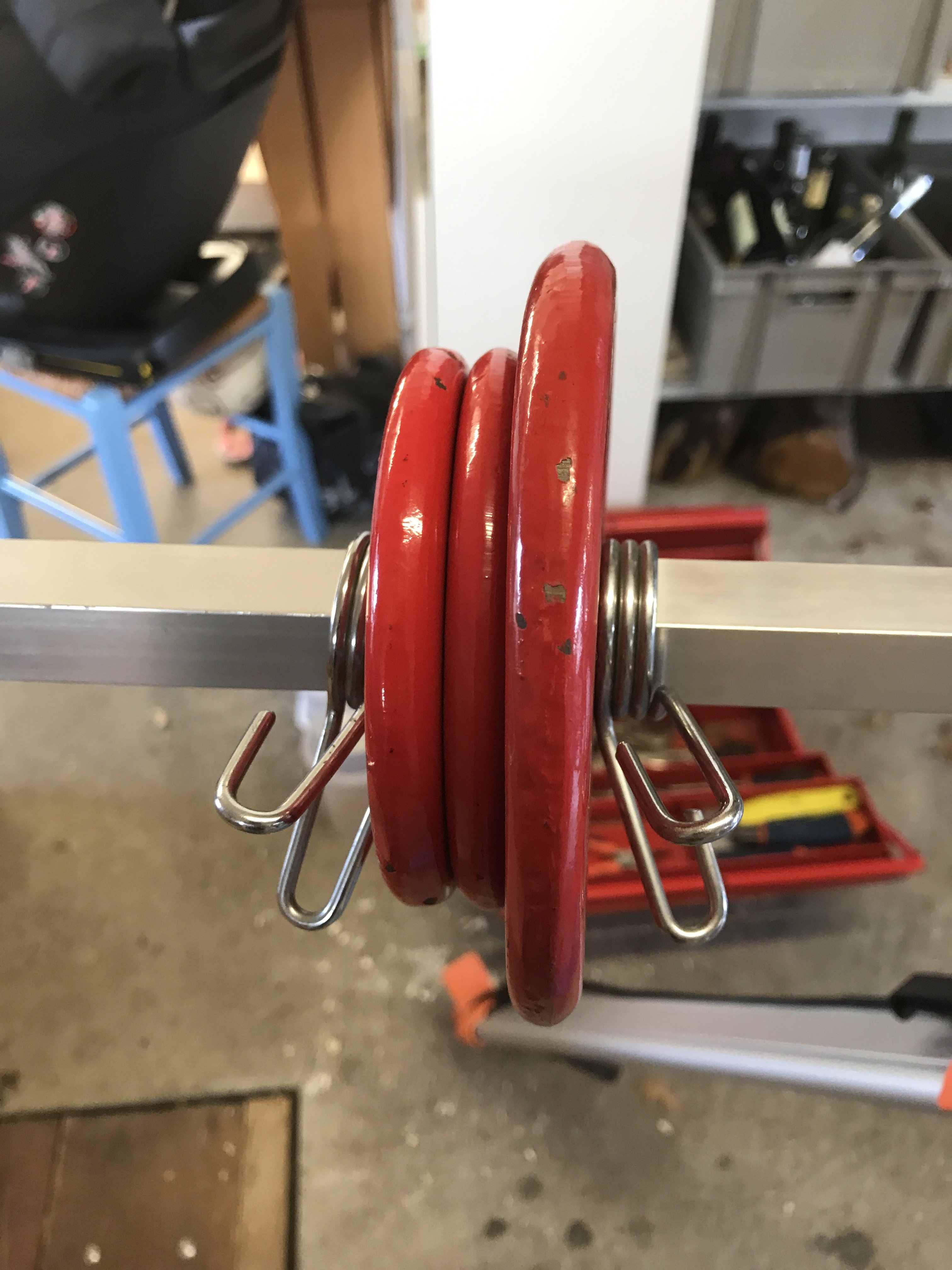 reste plus qu'à serrer avec des pinces ou meme mieux, avec les ressorts originaux de mes haltères c'est plus léger et ça serre plus proche des poids donc plus stable, et ça tient nickel!