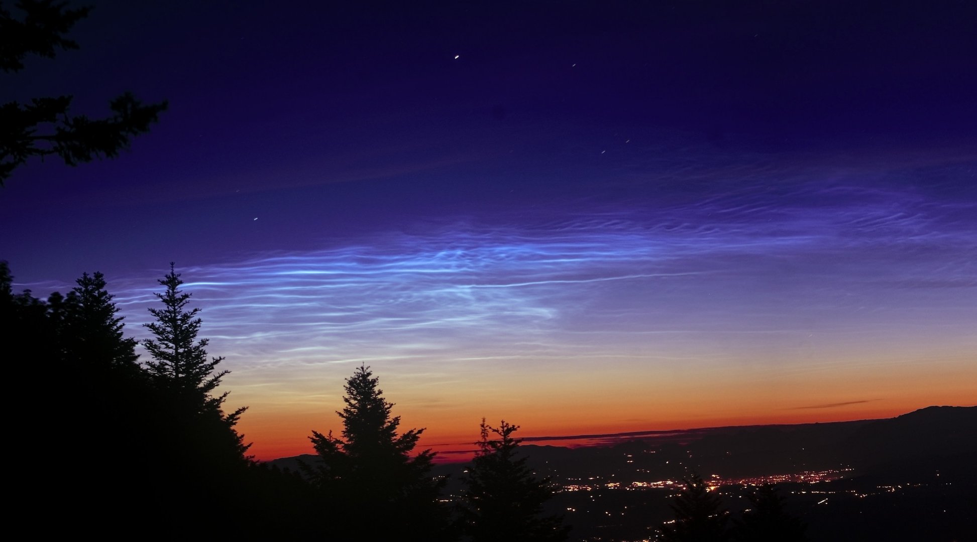 Tout à fait ! Ce sont des nuages mesospheriques chargés de poussières de météorites. La mesosphere étant à 80km d'altitude, ces nuages sont éclairés "par dessous", ils sont invisible de jour car l'atmosphère est illuminée et les cache.