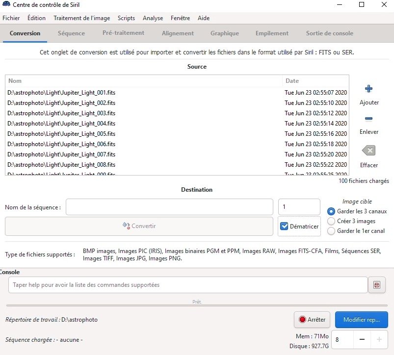 Ron Posté 23 juin 2020 Posté 23 juin 2020 (modifié) Salut, je suis en train de tâtonner avec Siril 0.9.12 pour essayer de comprendre comment il marche. Pour le moment, sur macOS 10 ou Windonw 10, il plante pas mal. Pas de message d'erreur, juste il plante. Là par exemple, j'essaye de mettre des fichiers FITS de Jupiter. Si je coche Dématricer, il va importer les FITS et planter à la fin. Edit : en fait, tant que je ne sélectionne pas Garder les 3 canaux, c'est bon. Mais c'est une caméra couleur que j'ai moi... Modifié 23 juin 2020 par Ron