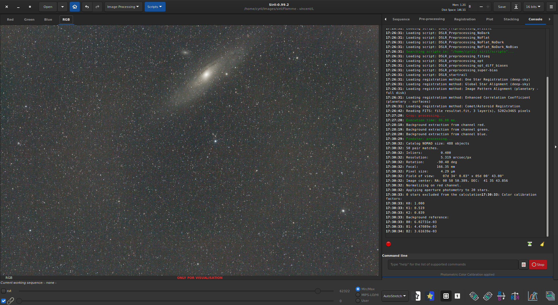 sg1seb Posté 26 juin 2020 Posté 26 juin 2020 Bonjour, je sollicite votre aide pour un soucis que j'ai pour la 1ere fois sur Siril, en effet en suivant le tuto dispo sur webastro pour le traitement d'une image a l'APN cela fonctionnait bien ( Orion cet hiver top ) mais aujourd’hui sur ma première tentative sur M31 l'étalonnage des couleurs par photométrie plante; alors que je clique bien sur obtenir les métadonnées de l'image 14:57:02: Taille du catalogue NOMAD : 486 objets 14:57:02: La résolution astrométrique a échoué. L'image n'a pas pu être alignée sur les étoiles de référence. j'avoue etre un peu perdu; ci joint le fichier resultat.fit et le log; il semble que sur une des photos l'alignement des étoiles ne fonctionne pas? j'ajoute que jai 34% de perte en réglant l'histogramme en auto ? alors que j'ai bien recadré l'image ? need help !!! merci beaucoup!! resultat.fit 2020-06-26T13.04.01Z.log