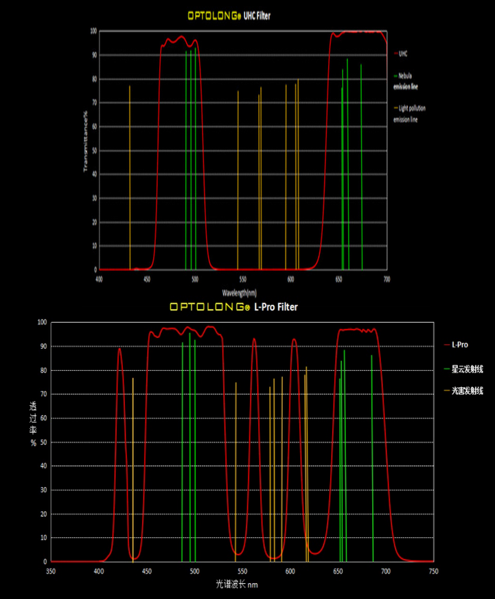 Optolong L-Pro (190€) : Ha, SII, NII, OIII, Hb (bande passante inconnue)