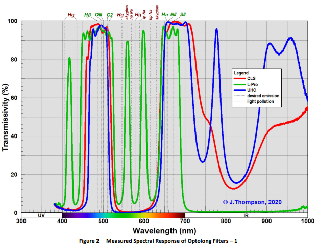 On voit donc que les CLS (non CCD) et UHC ne sont pas du tout adaptés derrière un réfracteur, sauf à adjoindre un filtre Ir-cut car ils laissent passer pas mal d'IR au delà de 700 nm. Optolong fait cependant un CLS CCD qui coupe à droite.
