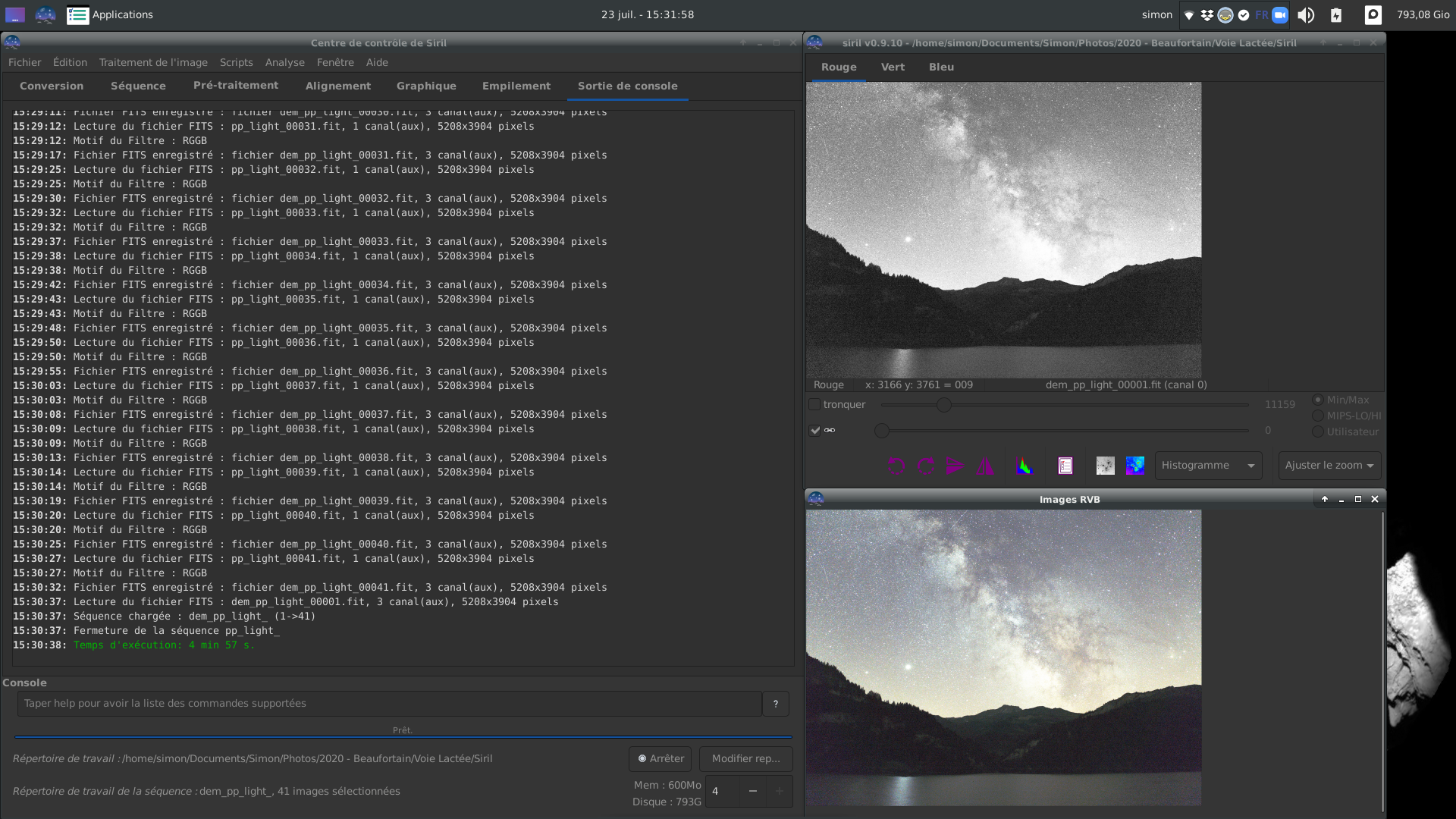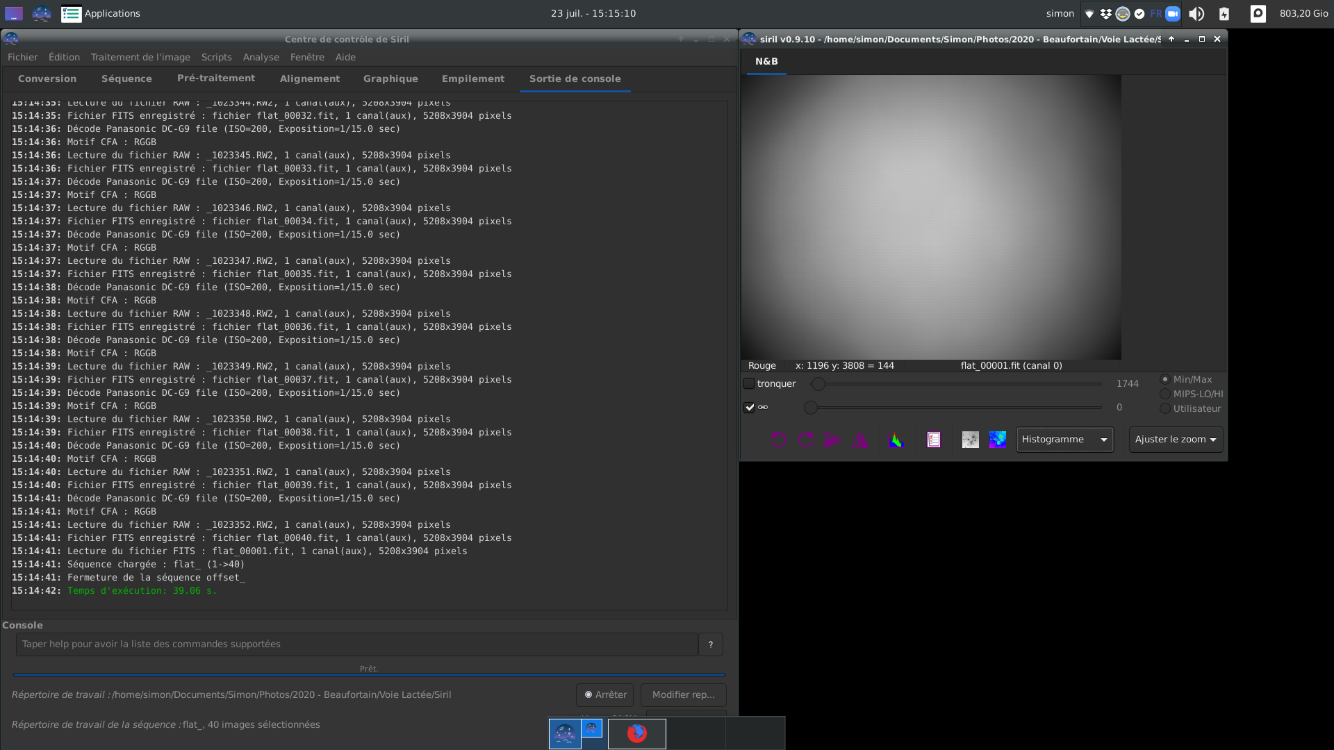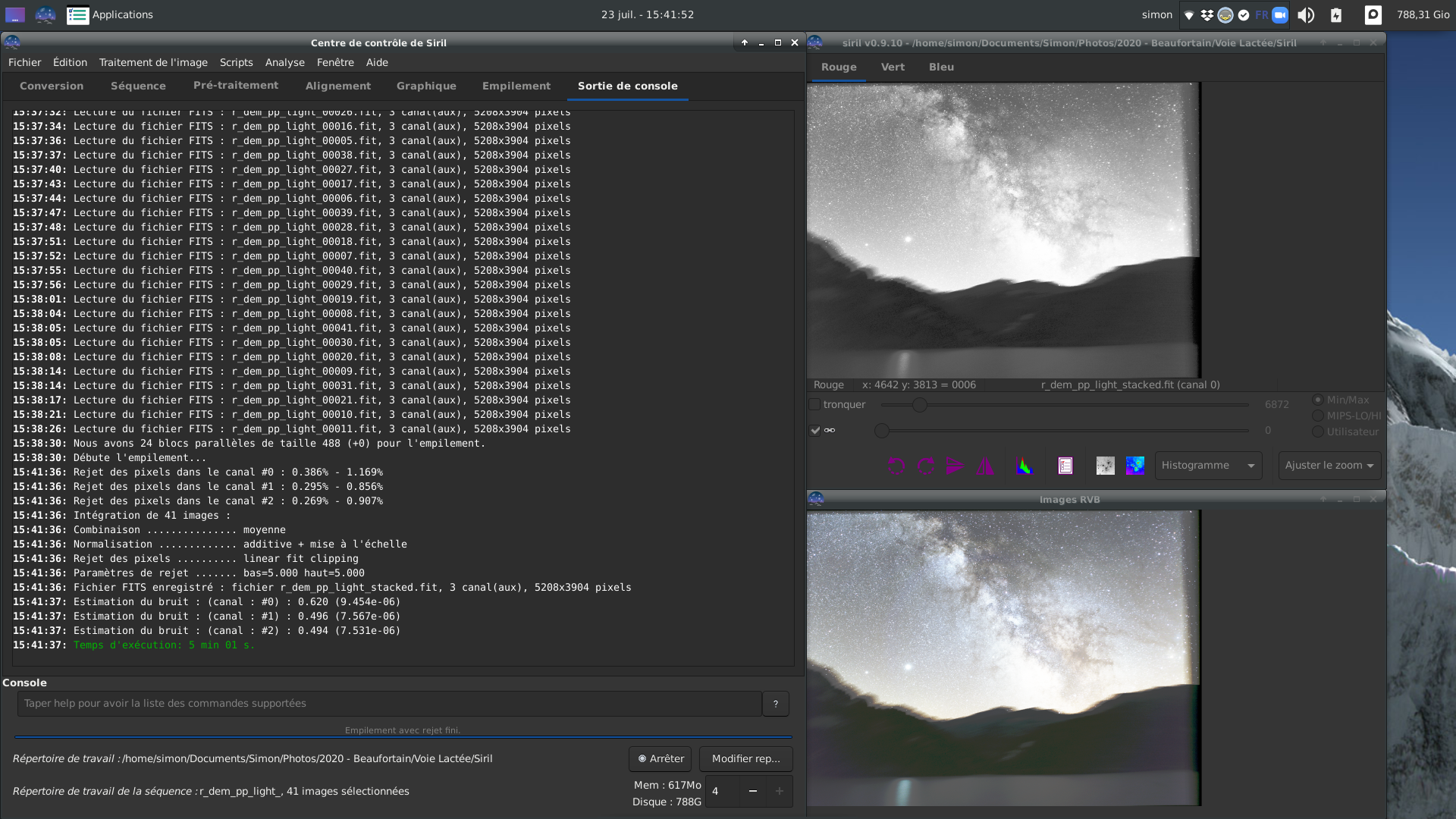 Siolan Posté 23 juillet 2020 Posté 23 juillet 2020 Bonjour à tous, Pour mes premiers essais de photo de la voie lactée, je suis allé dans les Alpes et ai pris 40 clichés de 15 secondes avec mon APN (Panasonic G9). J'ai aussi Darks, Flats et Offsets, mon but est donc d'empiler tout ça. J'ai essayé avec Séquator qui marche plutôt bien et est très facile à utiliser et maintenant je veux essayer Siril, voir ce que je peux faire avec. J'ai donc suivi le tutoriel vidéo (https://www.youtube.com/watch?v=5ix9KdVCIxE) mais j'ai deux problèmes: