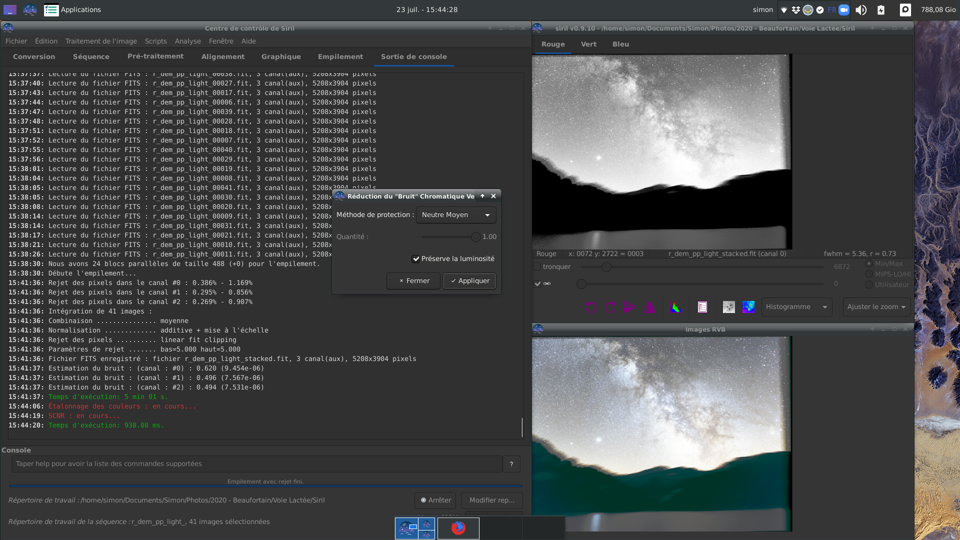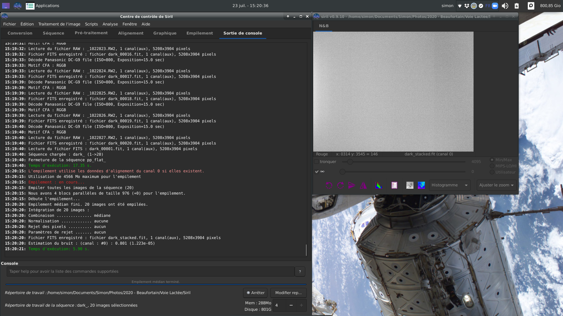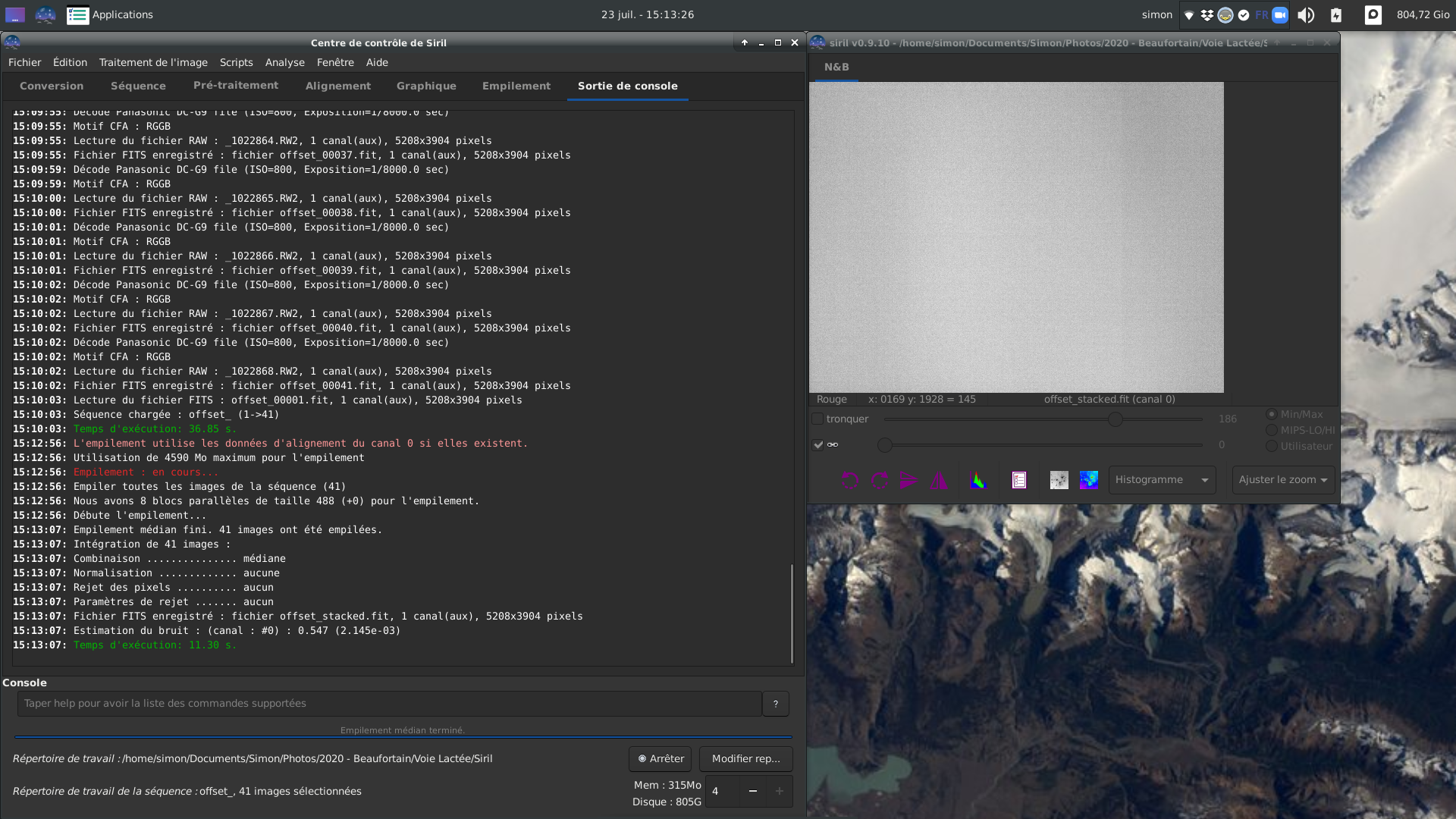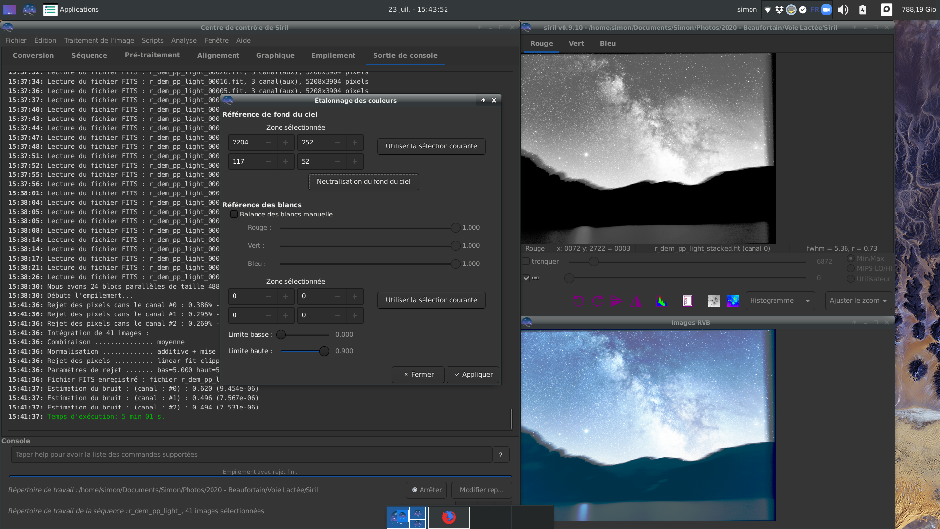 Siolan Posté 23 juillet 2020 Posté 23 juillet 2020 Bonjour à tous, Pour mes premiers essais de photo de la voie lactée, je suis allé dans les Alpes et ai pris 40 clichés de 15 secondes avec mon APN (Panasonic G9). J'ai aussi Darks, Flats et Offsets, mon but est donc d'empiler tout ça. J'ai essayé avec Séquator qui marche plutôt bien et est très facile à utiliser et maintenant je veux essayer Siril, voir ce que je peux faire avec. J'ai donc suivi le tutoriel vidéo (https://www.youtube.com/watch?v=5ix9KdVCIxE) mais j'ai deux problèmes: