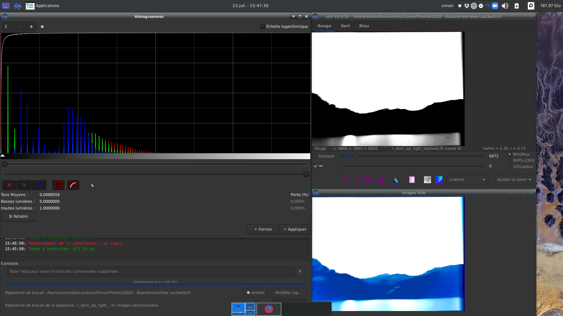 Siolan Posté 23 juillet 2020 Auteur Posté 23 juillet 2020 Je ne sais pas comment éditer mon post précédent, je reprends donc: Bonjour à tous, Pour mes premiers essais de photo de la voie lactée, je suis allé dans les Alpes et ai pris 40 clichés de 15 secondes avec mon APN (Panasonic G9). J'ai aussi Darks, Flats et Offsets, mon but est donc d'empiler tout ça. J'ai essayé avec Séquator qui marche plutôt bien et est très facile à utiliser et maintenant je veux essayer Siril, voir ce que je peux faire avec. J'ai donc suivi le tutoriel vidéo (https://www.youtube.com/watch?v=5ix9KdVCIxE) mais j'ai deux problèmes: - Lorsque je transforme l'histogramme automatiquement, l'image devient complètement surexposée et je ne comprends pas bien pourquoi ni comment régler finement l'histogramme. - Le premier plan est conservé sur toutes les photos et donc est flou, y a-t-il une manière de n'empiler qu'une partie de l'image comme sur Séquator ? Pour mieux comprendre, je joins des captures d'écran de toutes les étapes que j'ai suivi. Merci d'avance pour votre aide, Simon.