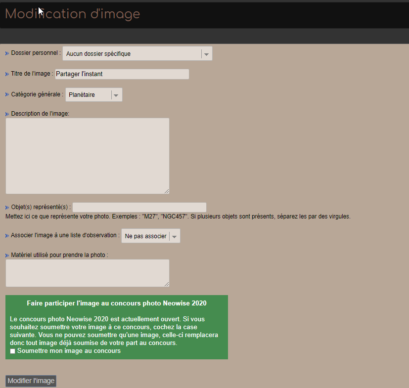 Tu cliques sur "Modifier l'image", puis tu coches dans le cadre vert "Soumettre mon image au concours" puis à nouveau sur "Modifier l'image" qui se trouve juste sous le cadre vert ! :)