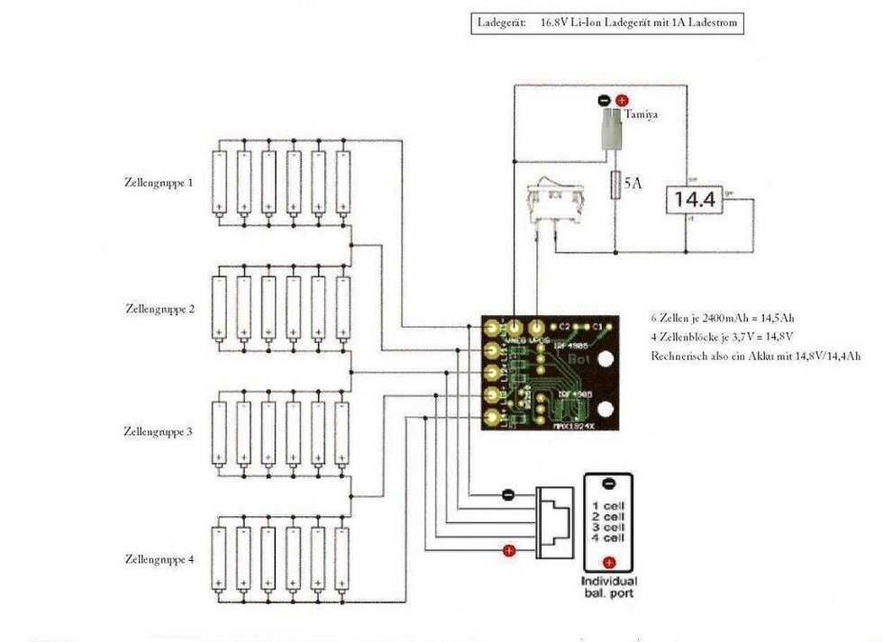 Imagine maintenant brancher 5 autres accus en parallèle à chacun des 4 accus (1S1, 1S2, 1S3 etc... jusqu'à 4S5, 4S6), et tu arrives au schéma de mon montage.