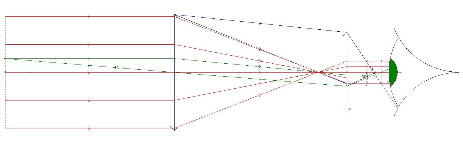 En fait la lucarne (le diaphragme de champ de l'oculaire), vient se placer au niveau du point de focalisation des rayons rouges. Tu vois donc bien que le champ (la lucarne) et la pupille de sortie sont complètement dissociés. ;)