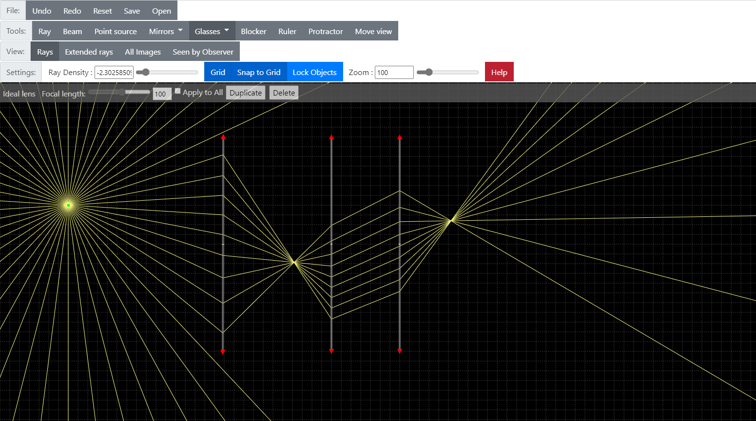 On ne peut pas entrer manuellement les coordonnées cartésiennes des points de fabrication des dioptres ou des rayons par exemple, donc on ne peut être être très précis.