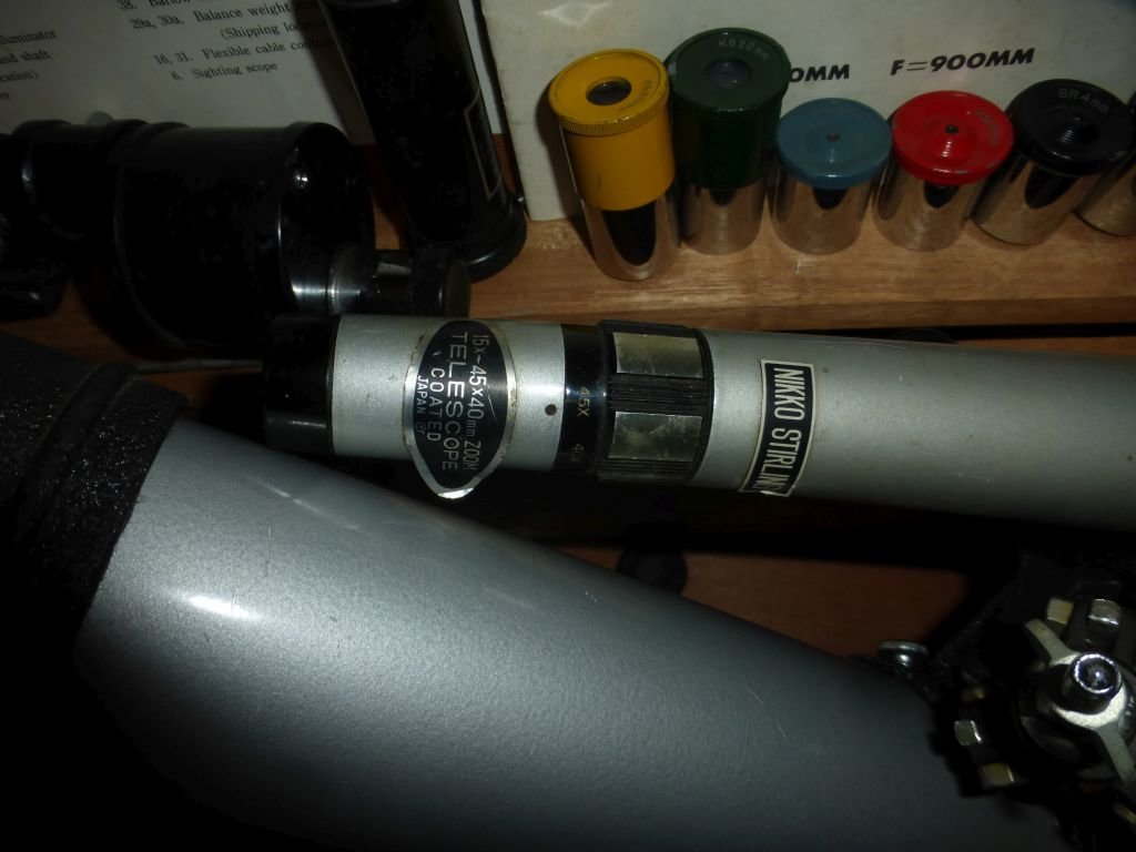 cajuva Posté 15 août 2020 Posté 15 août 2020 (modifié) Bonsoir, je viens de faire l’acquisition d'une lunette Nikko Stirling "circle (T) ". Dans sa boite d'origine en bois assemblé à queue droite il y a : Oculaires: ke 22 mm peint en vert HM 9 mm peint en bleu SR 4 mm tous les oculaires sont estampillés "Japan" sur le coté mais n'ont pas d'autres signes distinctifs Monture: A des années lumières d'une EQ 1 Énorme, surdimensionné, sans jeux apparent 🙂 lunette: Tube métallique léger achromatique séparé par un cerclage plastique (un autre viens se positionner en avant) Longueur entre l'objectif et le PO = 745 mm tirage de la mise au point= 55 mm tirage du tube dans le po = 146 mm léger jeu à la main ( pourquoi c'est artifice qui nui au chemin optique 🙁...? ) Trépied: tripodes section 55x35 . Repose au sol sur des "patins" en caoutchouc qui cachent des pions métalliques 4 repaires de hauteurs sont gravés dessus porte ustensiles : 6 trous coulant 24.5mm + 2 certainnement filtre. Petite lampe 🙂 longueur mini 740 mm et maxi 1320 mm ( longueur prise du bas jusqu'à la vis de fixation de la monture.Il faut compter 280mm en plus jusqu’à l'axe optique ) Chercheur: Achromatique collé 6x30mm occulaire réticulé à enfourchement ( la croisée des mondes 🙂 ) un des deux fils a la forme d'un oméga, certainnement du à la colle qui a cédé .... Ustensiles: une barlow 2x un renvoie d'angle 90° à prisme un redresseur terrestre un filtre solaire à visser filtre lunaire manquant . une carte du ciel hémisphère nord pas tellement utilisable 😉 et un lexique en anglais qui indique que la lunette est une 450 power 60 mm equatorial refractor telelescope . Il manque également d’après la doc l’écran de projection du soleil ( pas grave j'en ai 😉 ) Était fournit avec une lunette 15x-45x40mm Nikko Stirling (T) avec son trépied . J'ai commencé à nettoyer tout ça , il me reste le plus chaud à faire : les objectifs 😞 Une fois fait cette Nikko ira se frotter gentiment à la Pentax 🙂 a suivre qqes photos Caju 💫 Modifié 16 août 2020 par cajuva qqes corrections :-) 1