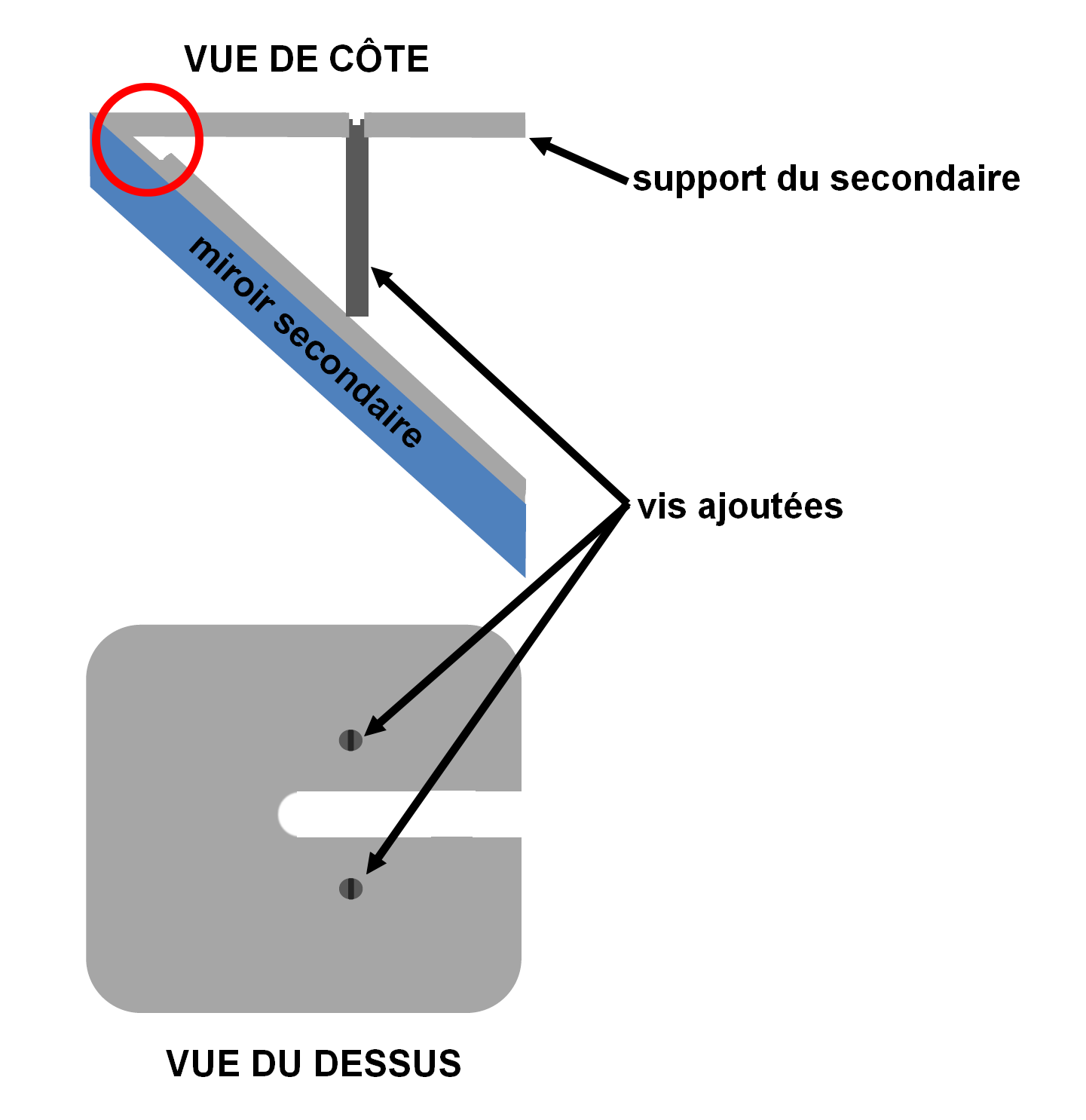 • Rigidification du support du miroir secondaire (pièce en V) en le taraudant (opération risquée...) pour y ajouter des vis sans têtes qui "transforment le V en A". Je pensais que le support du secondaire manque de rigidité à cause de la rainure entourée en rouge sur l'image ci-dessous. Honnêtement je ne conseille pas cette modification car elle est risquée pour le miroir secondaire, et d'après mes calculs la flexion du support du secondaire semble négligeable : décalage de l'axe optique de l'ordre de quelques dixièmes de millimètre (pour le moment j'ai estimé les dimensions du support, faute de l'avoir sous la main).